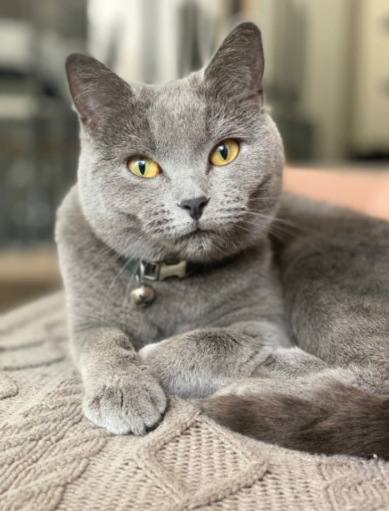 Makeda is een Britse korthaar, volldig grijs met opvallende geel/gouden ogen en draagt een groen halsbandje