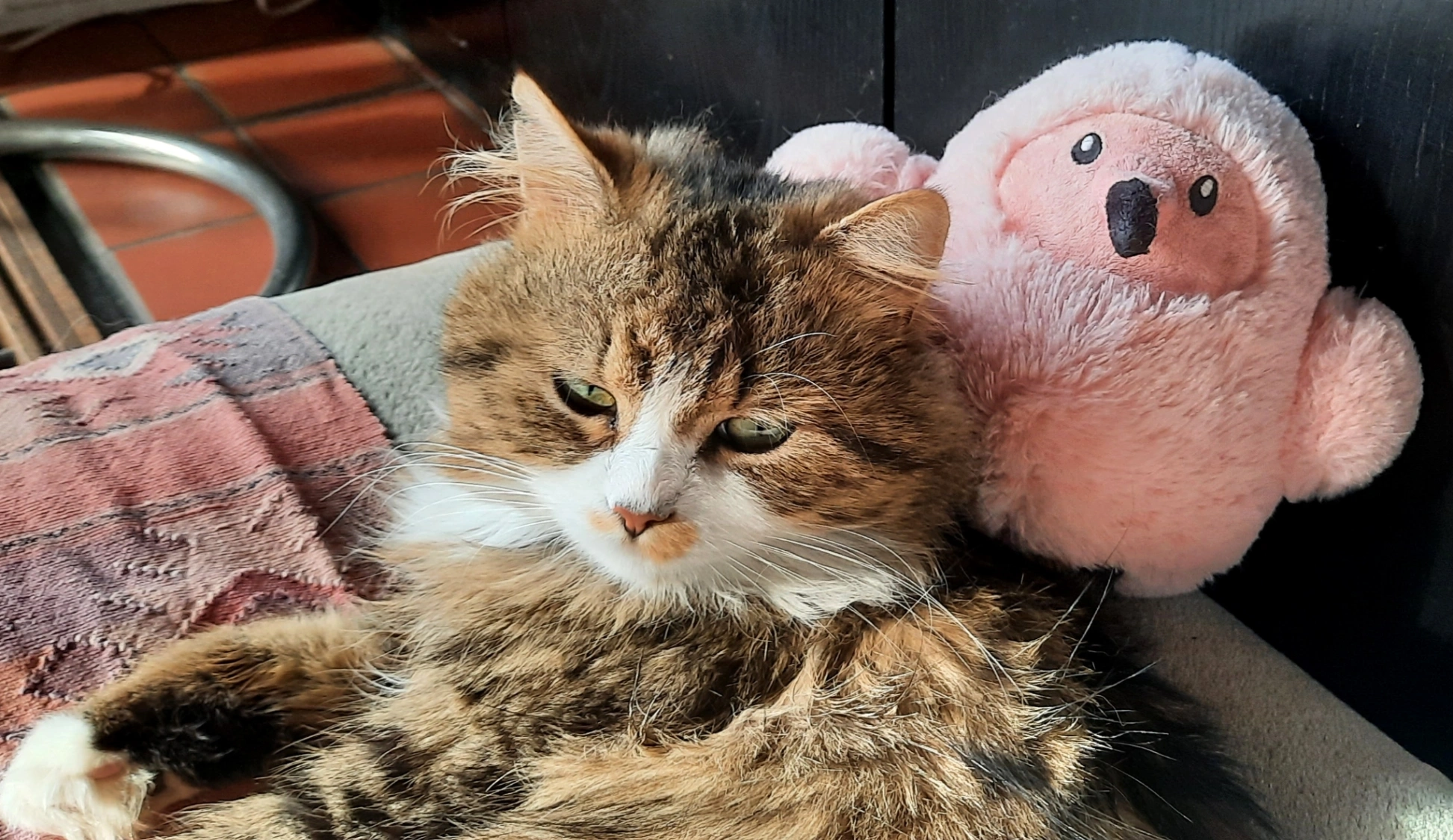 Kater met knip in oor. Dikke harige pels, grijs en bruin en wit gevlekt. Licht bruin vlekje op de witte neus.