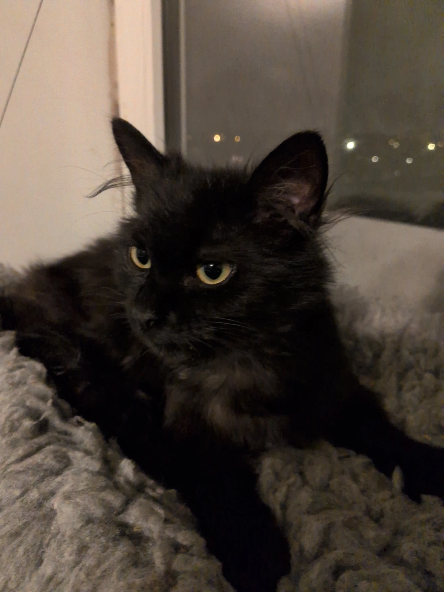 Il est très câlins et joueur. Il a environ 11mois et il est un peu craintif, il réagit a son nom ou ses surnoms "Cracra ou Crapule" il ne sait pas miauler mais essaye pour se faire comprendre