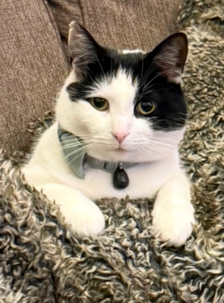 Black and white, one year old, chipped. Friendly and inquisitive but very shy.