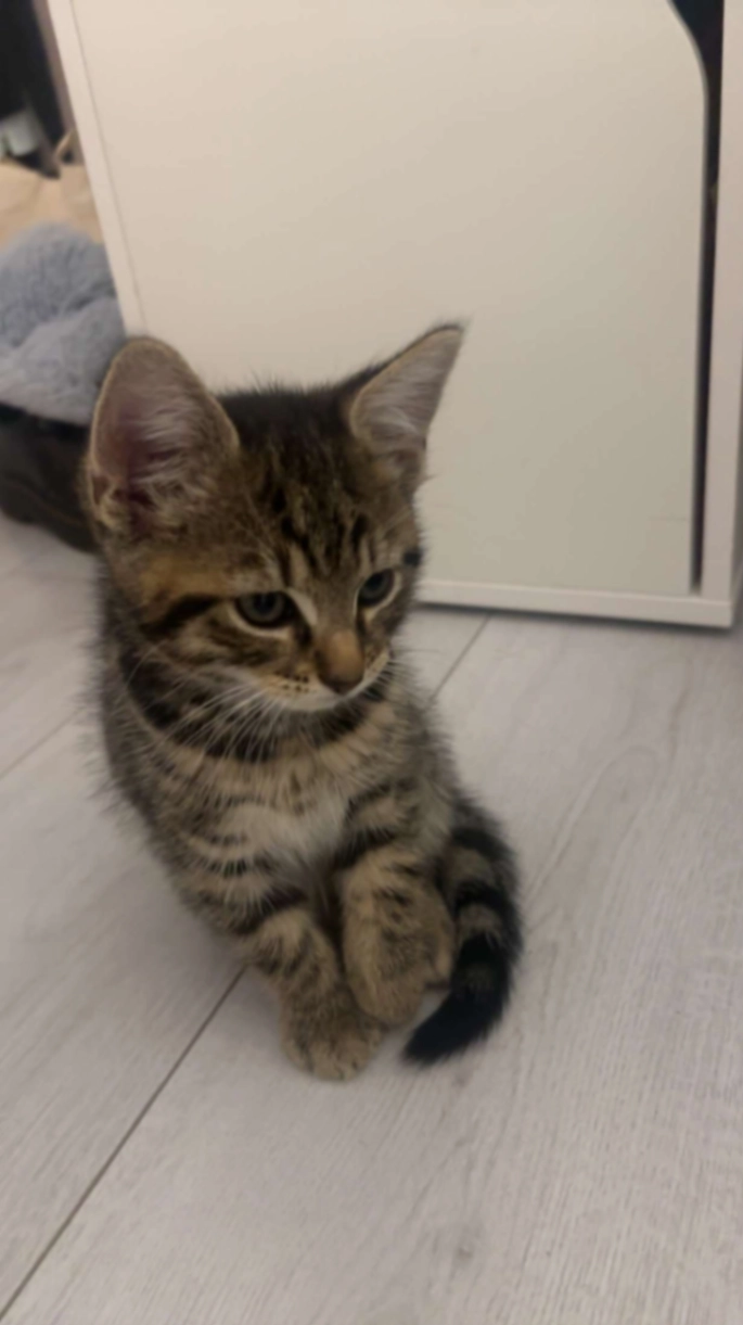 Female tabby cat, She has orange markings on her right rear and a white chest