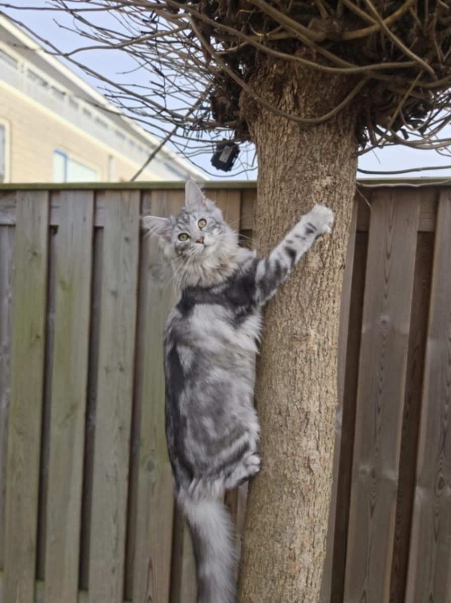 Stormy heeft een lichtgrijze vast met een prachtig patroon met donkere lijnen. Ze heeft geel groene ogen en pluimpjes op haar oren.
