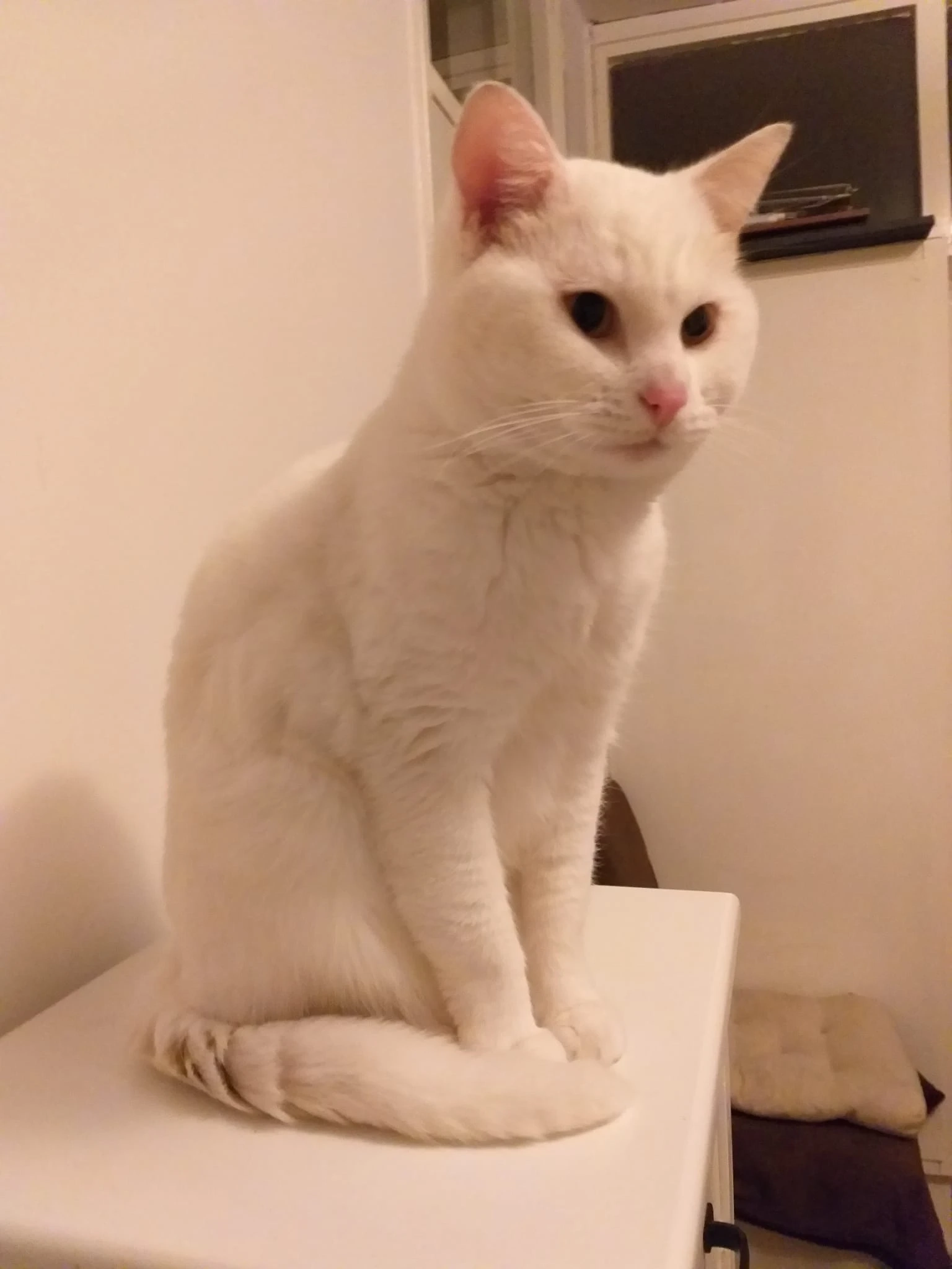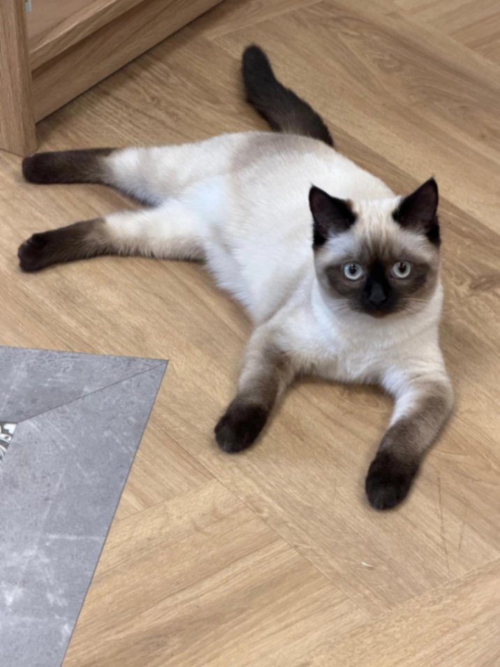 Bella is een licht beige, bijna witte Siamees met zwarte oortjes, pootjes en snuit. Ze is tenger van postuur omdat ze nog maar 7 maanden oud is
