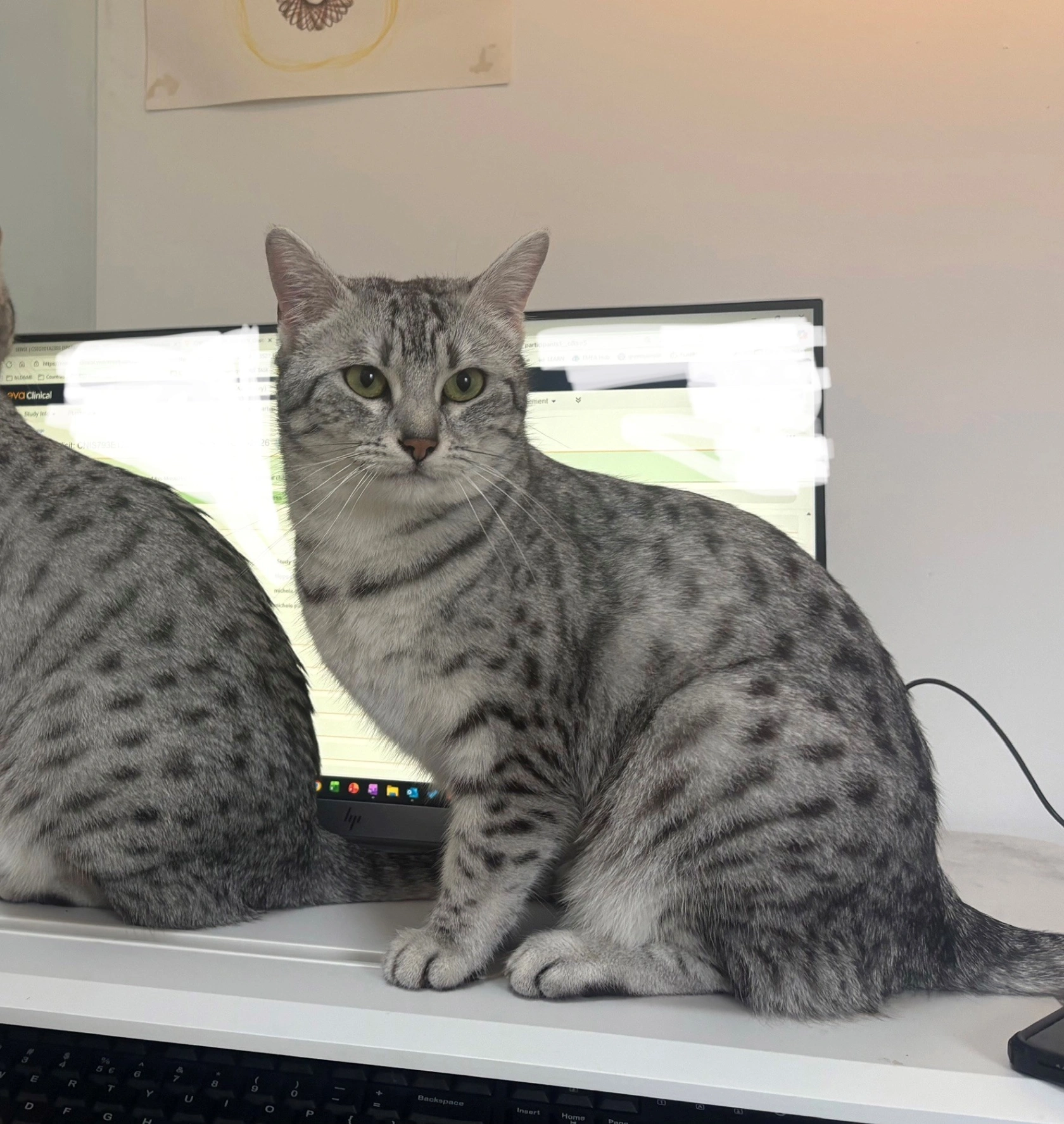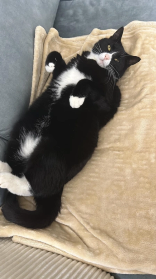 Zwart met witte bles in een dun lijntje loopt door rondom het snuitje, witte kin en bef, witte borst, witte voetjes voorpoten, witte buik, witte sokjes achterpoten.
