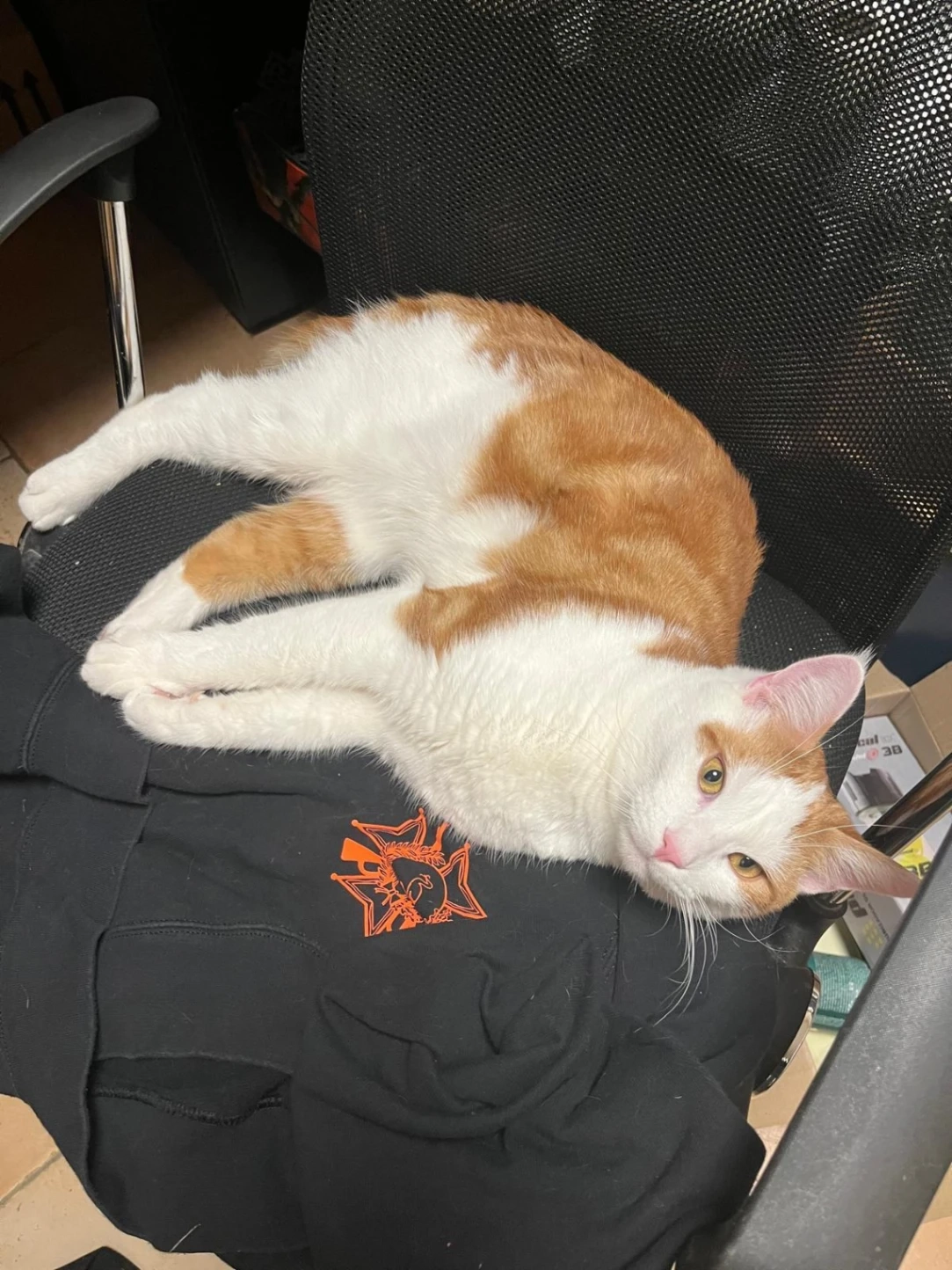 Maine coon x; 1 jaar oud met chip. Wit met cypers rood. Kop wit, alleen tussen ogen en oren rood. Goudkleurige ogen. Rechteroor wit, linkeroor witte rand, rood oor. Brede rode baan van af bovenkant kop, loopt door naar rug. Daarnaast wit. t/m schouders. Keel, borst en buik wit. Voorpoten wit. Rug en flanken rood gestreept. Heupen wit. Achterpoten wit met rode vlek op linkerachterpoot (binnenkant). Rode gestreepte staart.