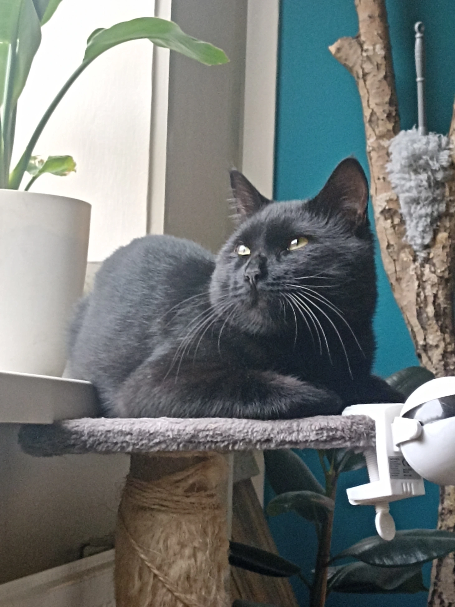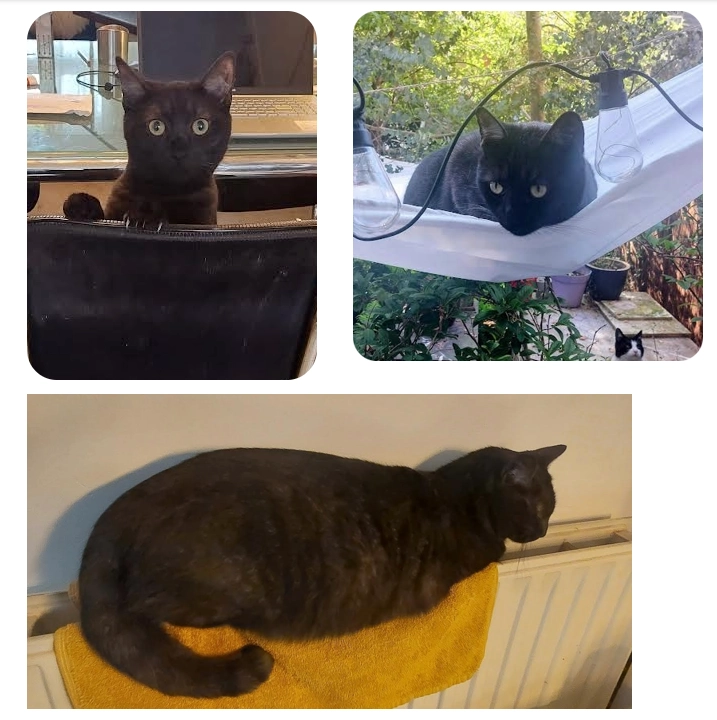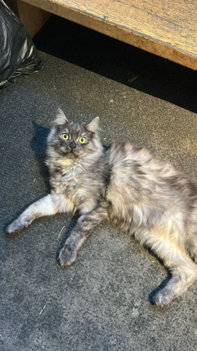 Mollige poes (ca 8 kg) met rond koppie en dikke vacht. Ze is zwart smoke tabby: zwart/antraciet met witte ondervacht. Ze mauwt zelden, en dan maar heel zachtjes. Ze is gechipt en chip staat goed geregistreerd.