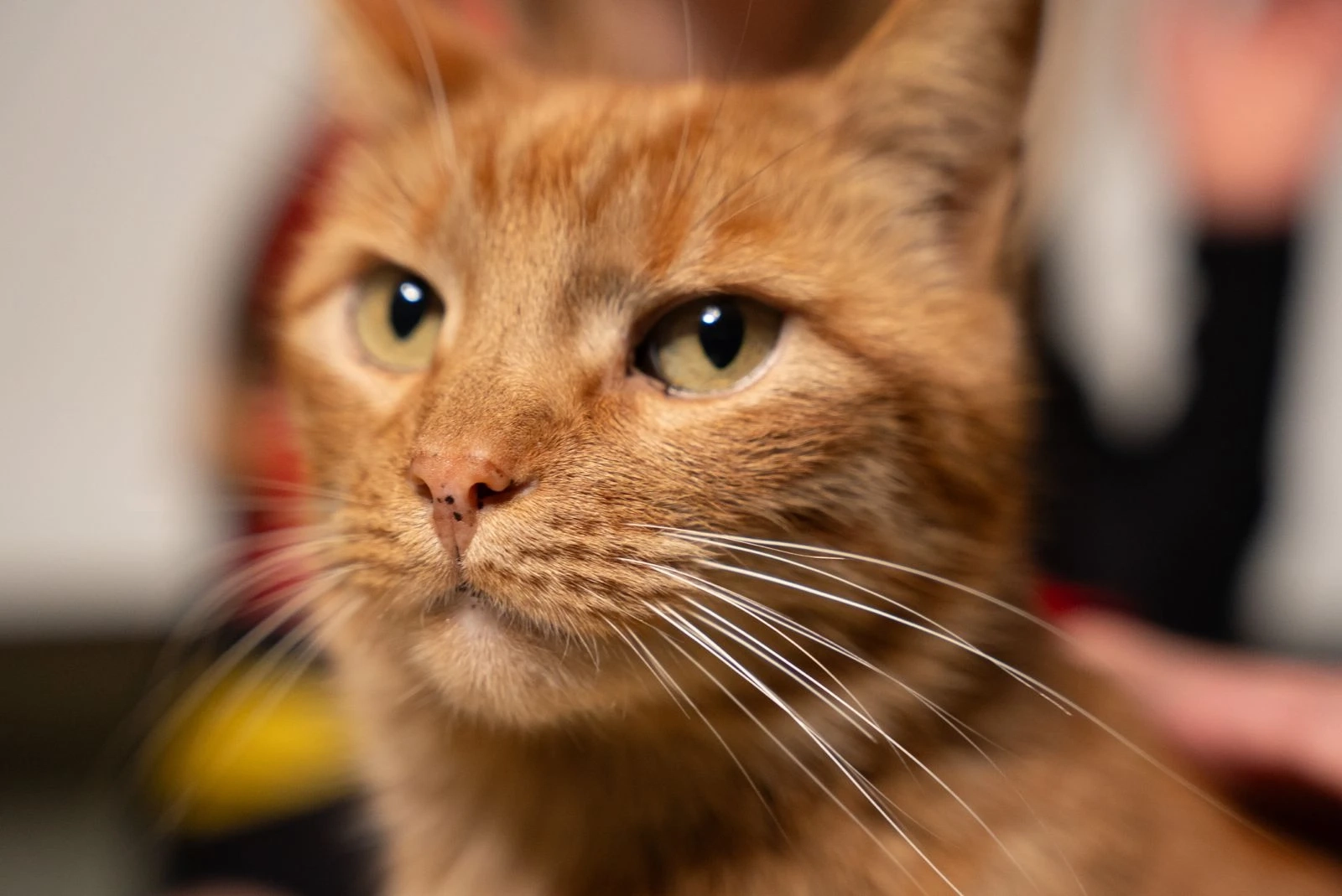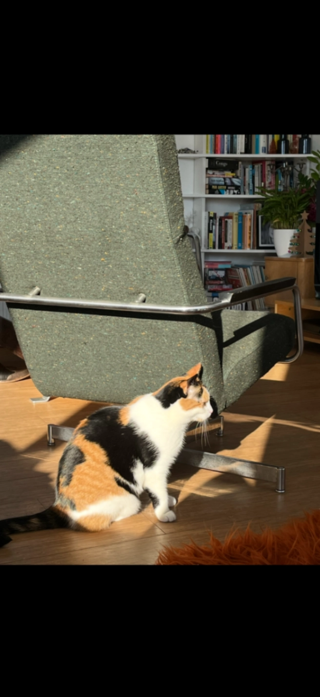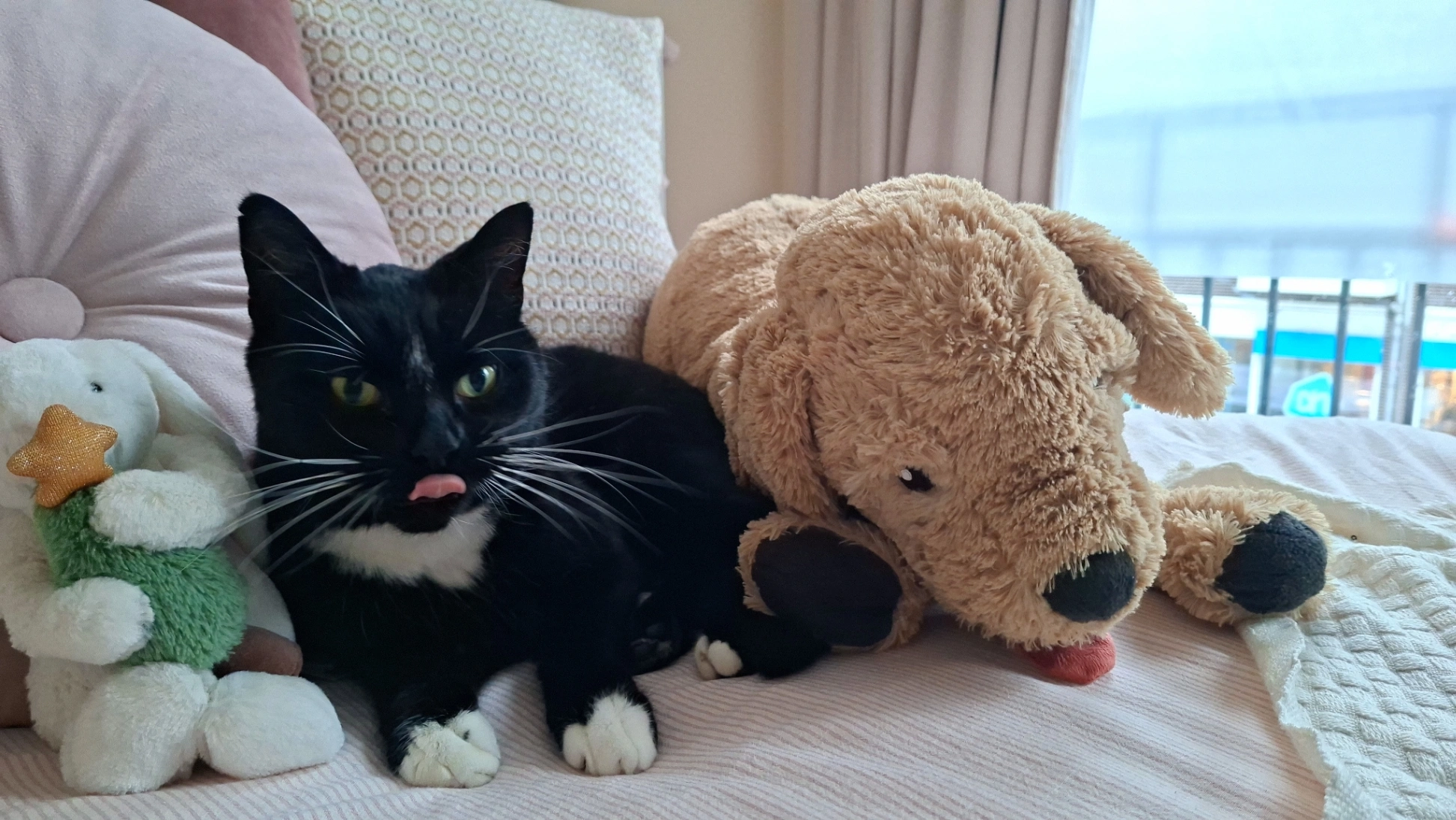 Voornamelijk zwarte poes, witte vlek op de kin, witte bef. Wit op de buik. Witte poten en één witte snorhaar aan haar rechterkant; slechts één. Haar tenen zijn een mix van roze en grijs en ze heeft een heel pluizige staart. Ze weegt ongeveer 5 kg en heeft een kleine kop met groene, soms gele ogen.