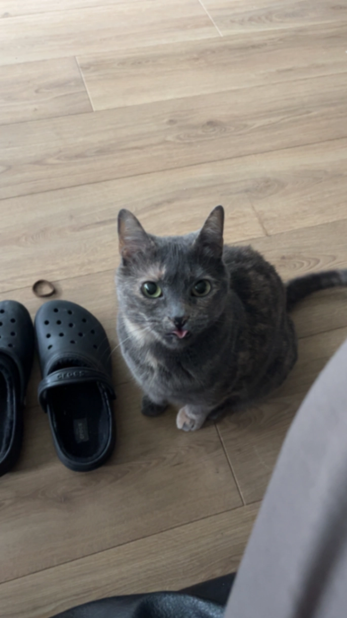 Hij is net twee weken uit het asiel, nog een beetje angstig. Hij heeft op een of andere manier het kattenluikje open gekregen.