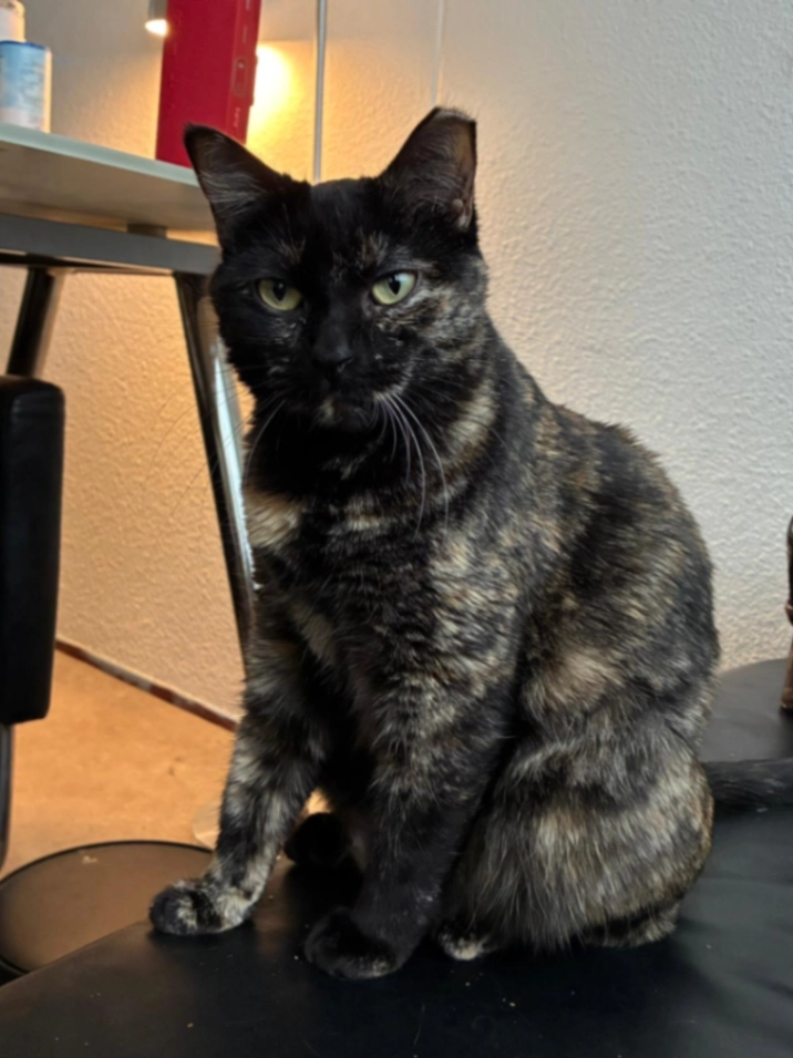 Zwarte kat, half lang haar, heeft een klein litteken op zijn neus. Luisterd naar de naam Cozmo