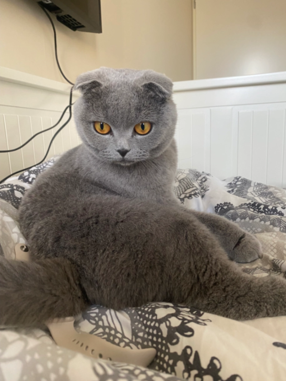 Brits korthaar met een grijze vacht met beige erin. Drie beige voetjes. Bruin-gele ogen.