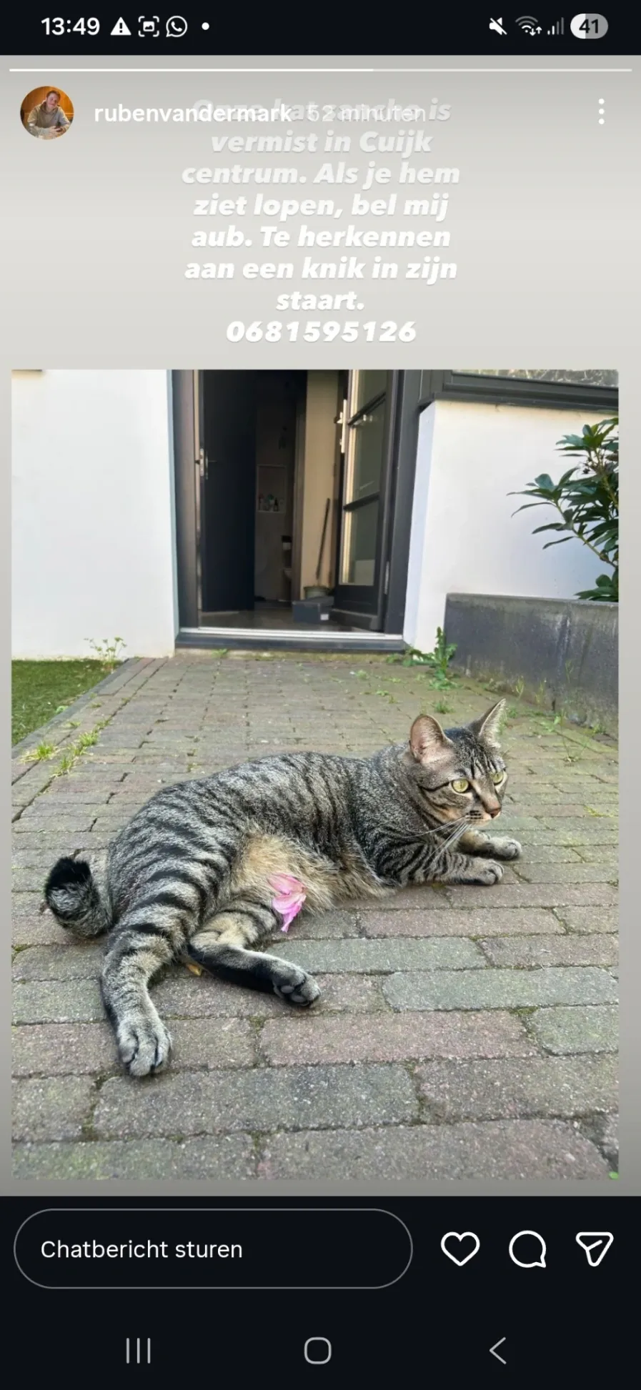 Heb je Mowgli misschien gezien? We zijn erg bezorgd. Zou je alsjeblieft in je garage, schuur, zolder, tuin en op je terras willen kijken?