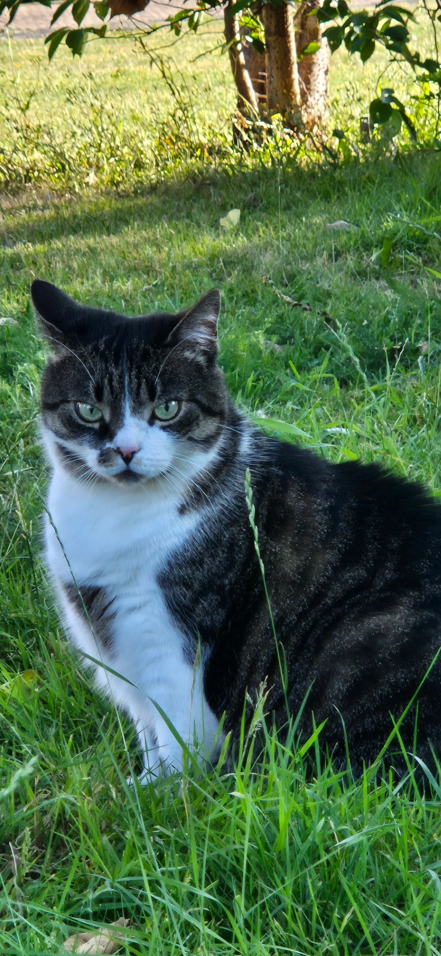Zwart en wit poes die heel lief en nieuwsgierig is. Hij heeft zijn naam โMistoโ en mijn telefoonnummer gegraveerd op zijn halsbandje.