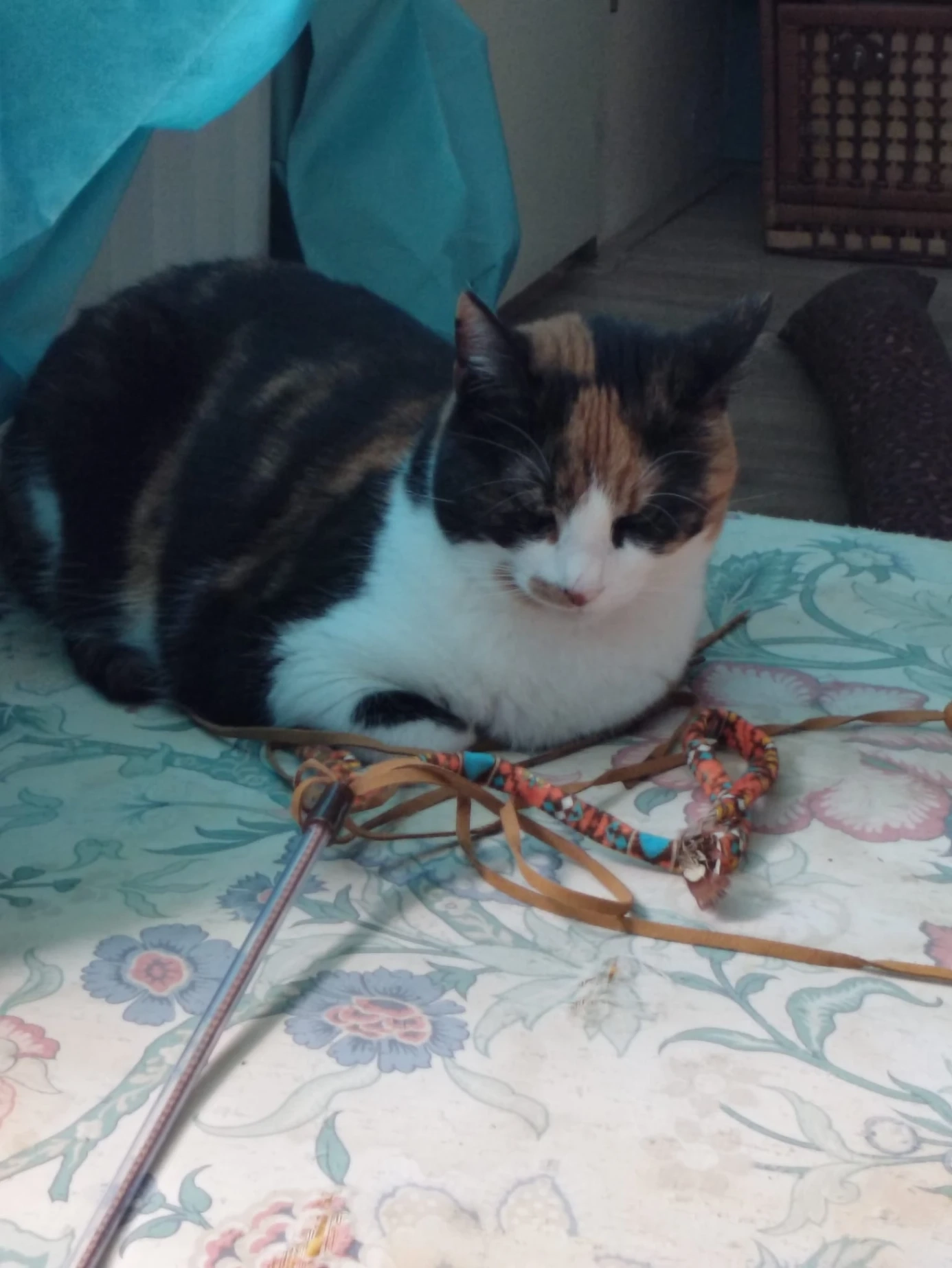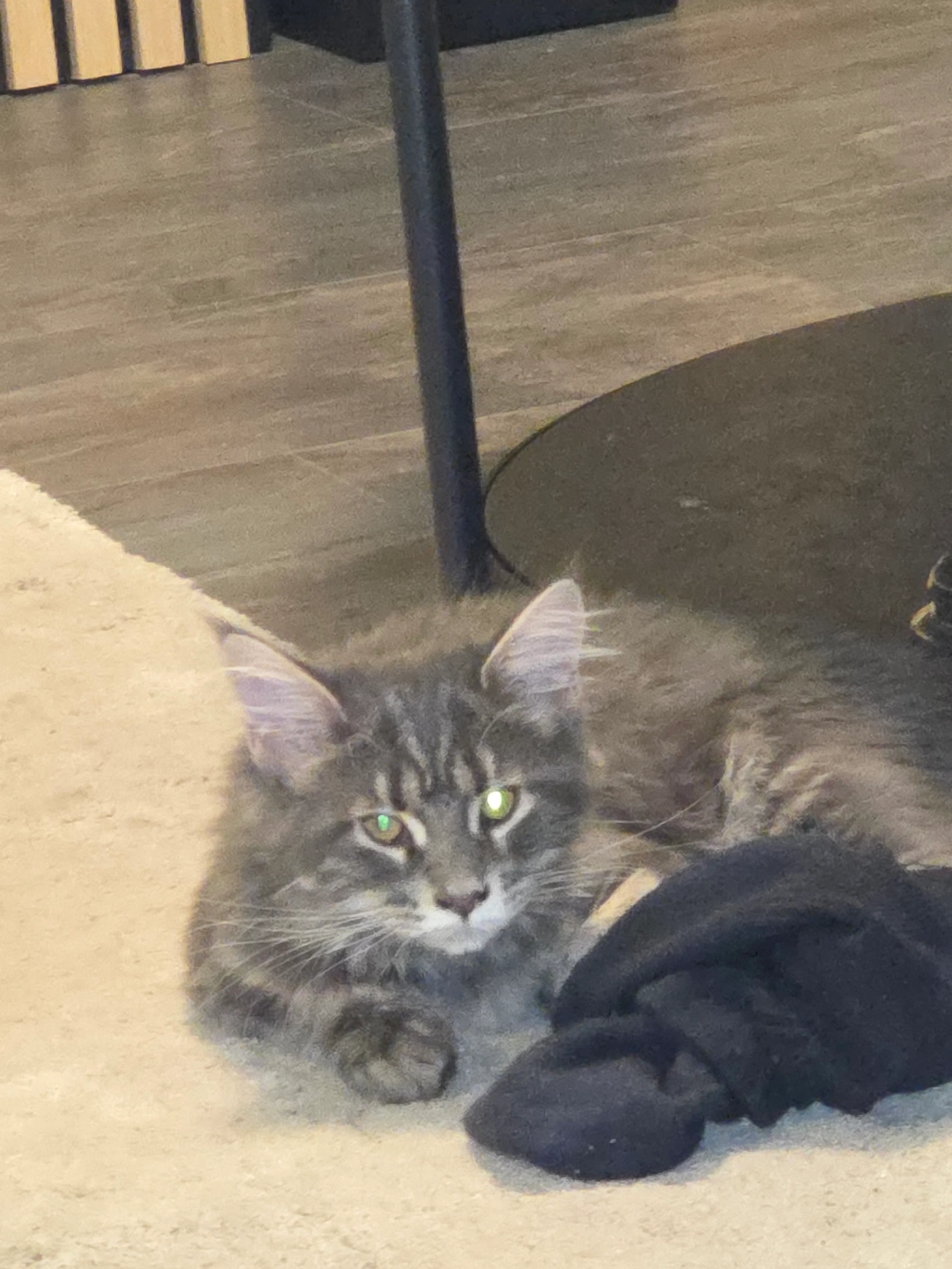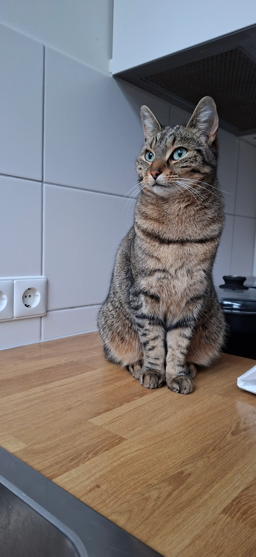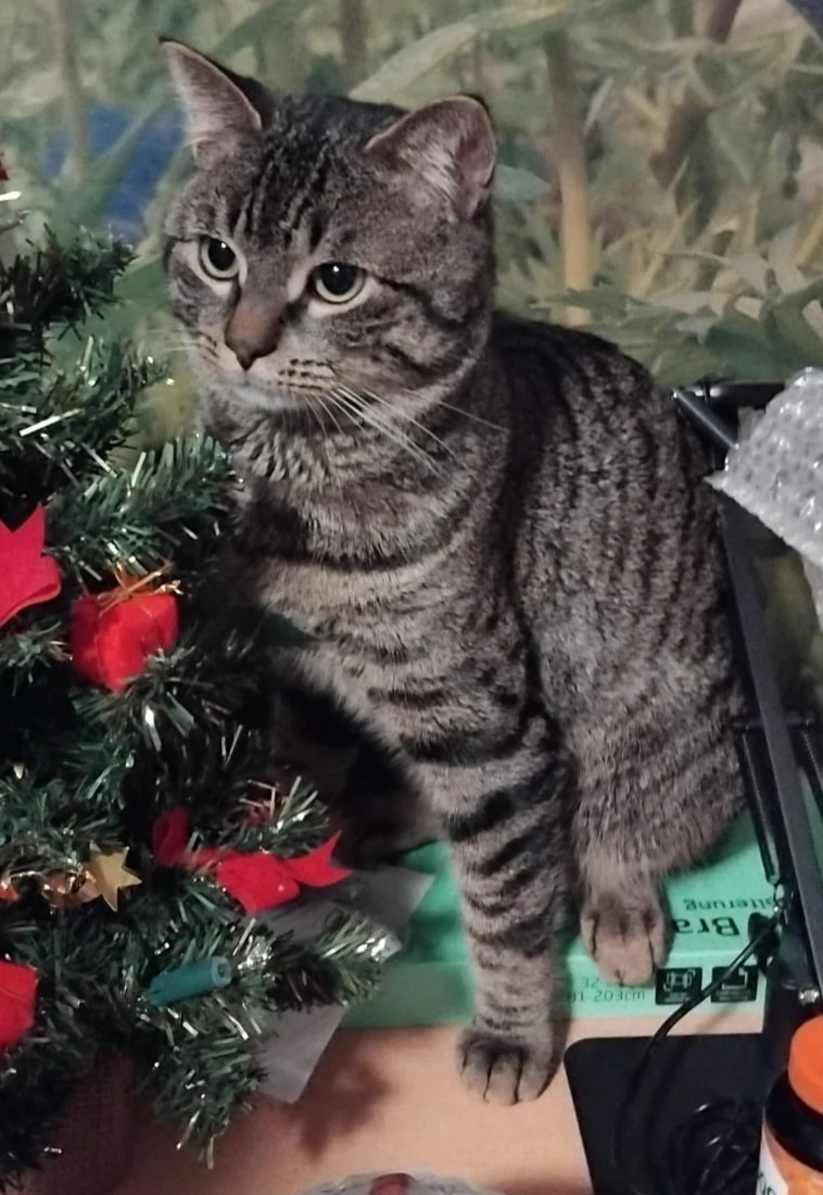 Grijs, gestreept, klein, met grote ronde ogen. Erg schuw, tam, is zonder halsband weggelopen.