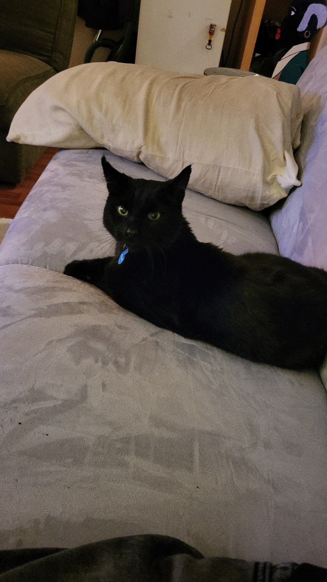 Hij heeft een blauw halsbandje om met naam plaatje waar z'n naam op staat Mephisto