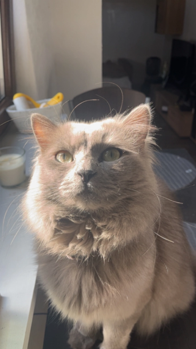 Ze is een bang 9 jarige kat, die houd van melk