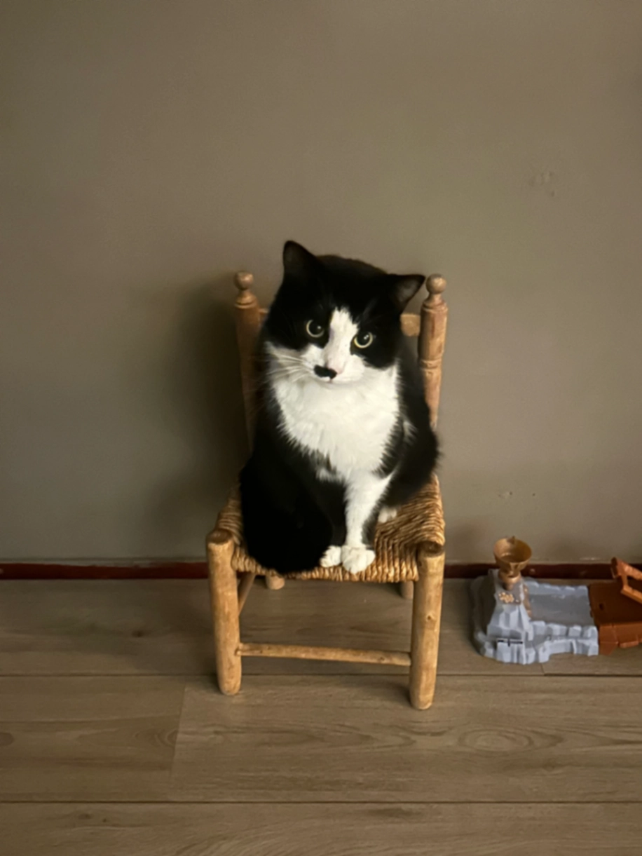 Zwart met witte kater. witte neus en wangen. Witte bef en linker voorpoot. Kenmerkend zwart vlekje onder neus