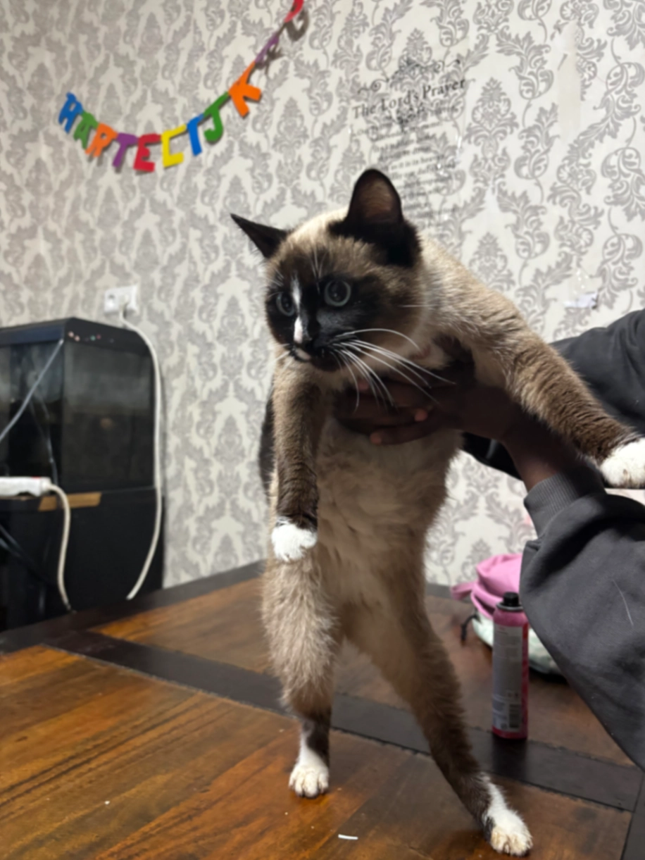 Het is een lieve kat, reageert op eten, kan een beetje schuw zijn. Hij heeft verder een neusje met witte pootjes, en mist een tandje