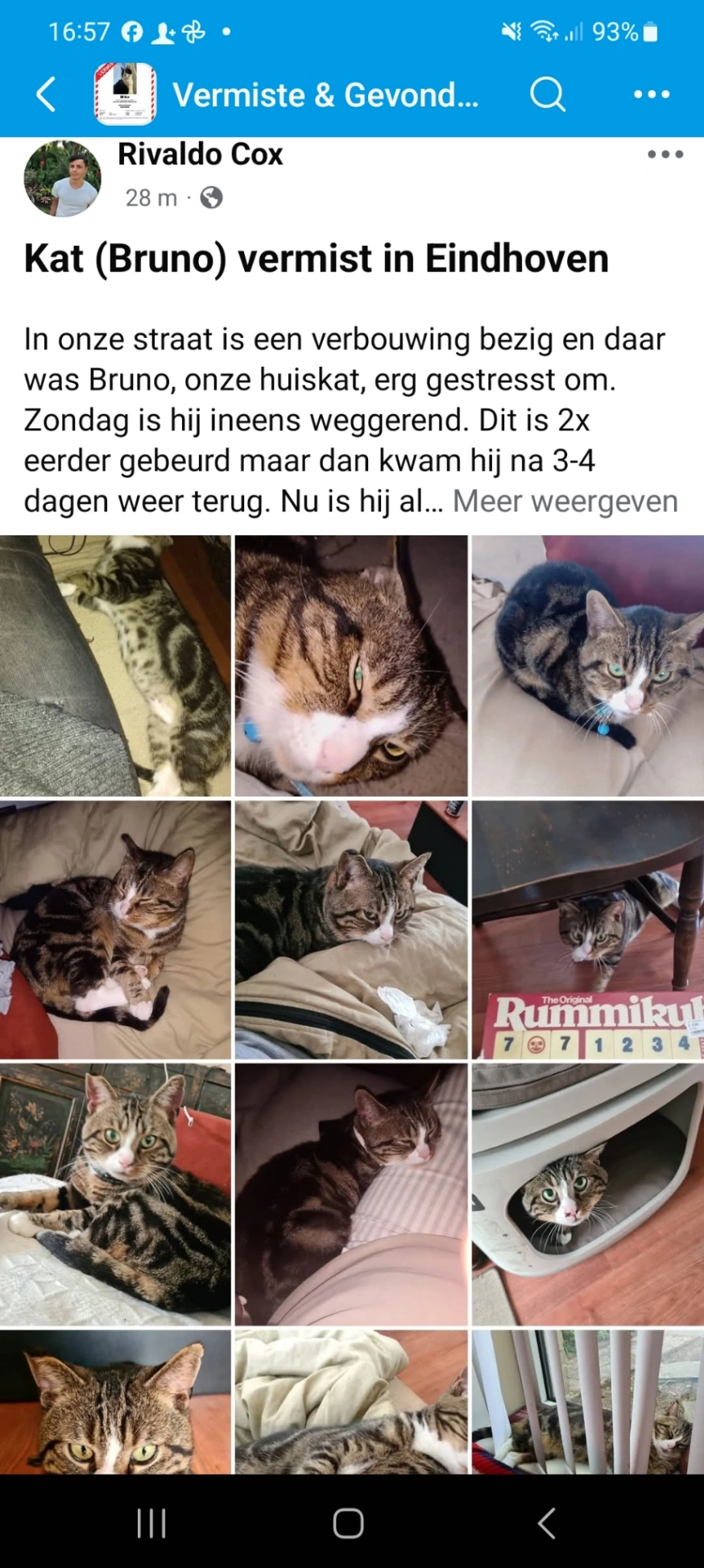 In onze straat is een verbouwing bezig en daar was Bruno, onze huiskat, erg gestresst om. Zondag is hij ineens weggerend. Dit is 2x eerder gebeurd maar dan kwam hij na 3-4 dagen weer terug. Nu is hij al een week zoek en we hebben overal gezocht. Laat het weten als je hem vindt, je kan ons bereiken op 0618375460. Hij is in Eindhoven kwijtgeraakt.