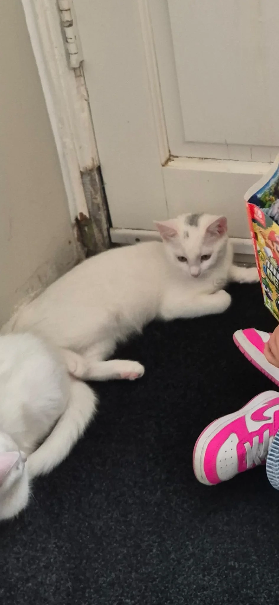 Helemaal wit met wat grijs tussen de oren. Erg aanhankelijk en lief