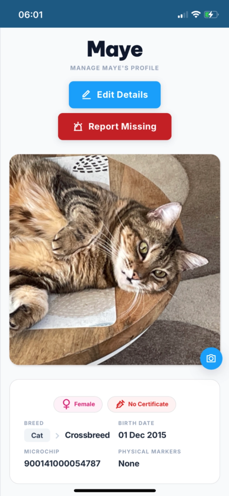 Hij droeg bij vermissing een lichtgroene halsband met reflectie. Op de halsband staan zijn naam en het telefoonnummer van eigenaresse. Hij is nog niet gecastreerd en niet gechipt.