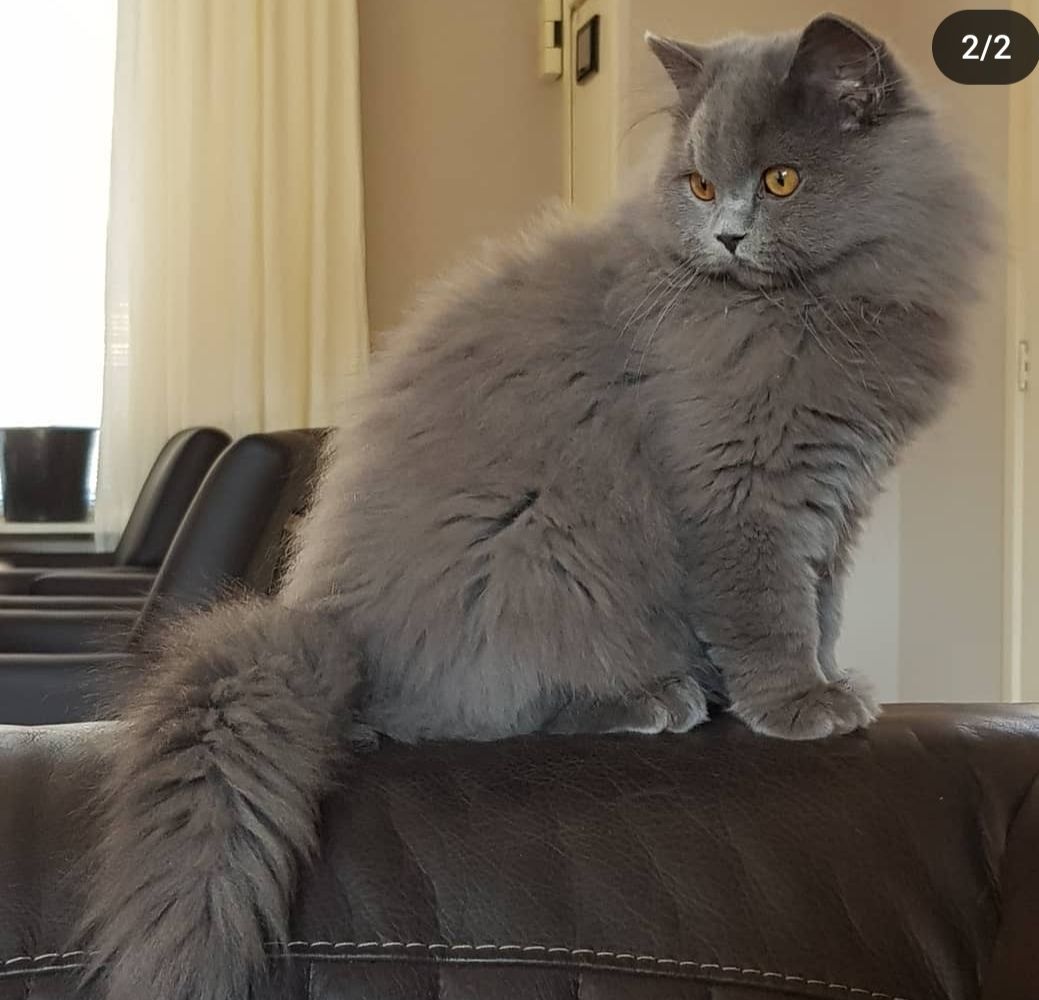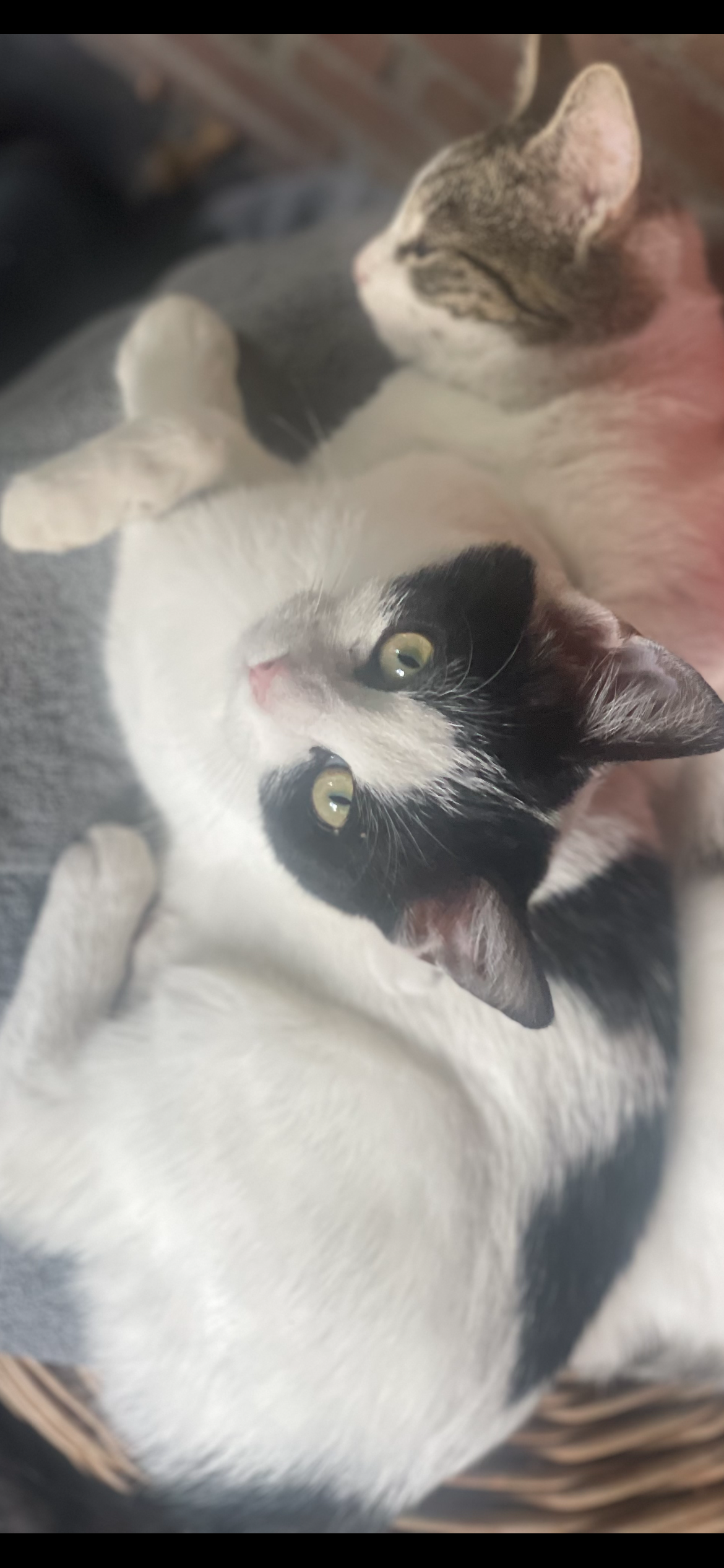 Toon heeft 2 zwarte oren een zwarte staart en 3 vlekjes aan de ene kant op zijn lijf . Andere kant is wit.