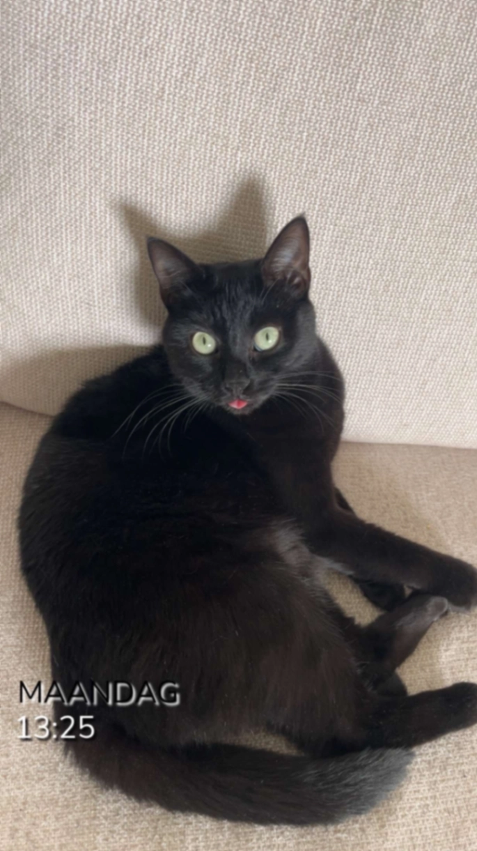 Kitty is een begaals vrouwtje van 10 maanden. Ze is pas net bij ons thuis en dus nog niet gewend. Ze is vermoedelijk weggeslopen door een raam in een slaapkamer dat op een klein kiertje boven stond.
