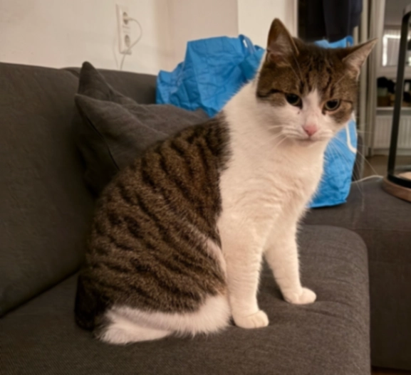 Piep is een vrouwelijke kleine en dunne kat met een wit vlekje op haar borst