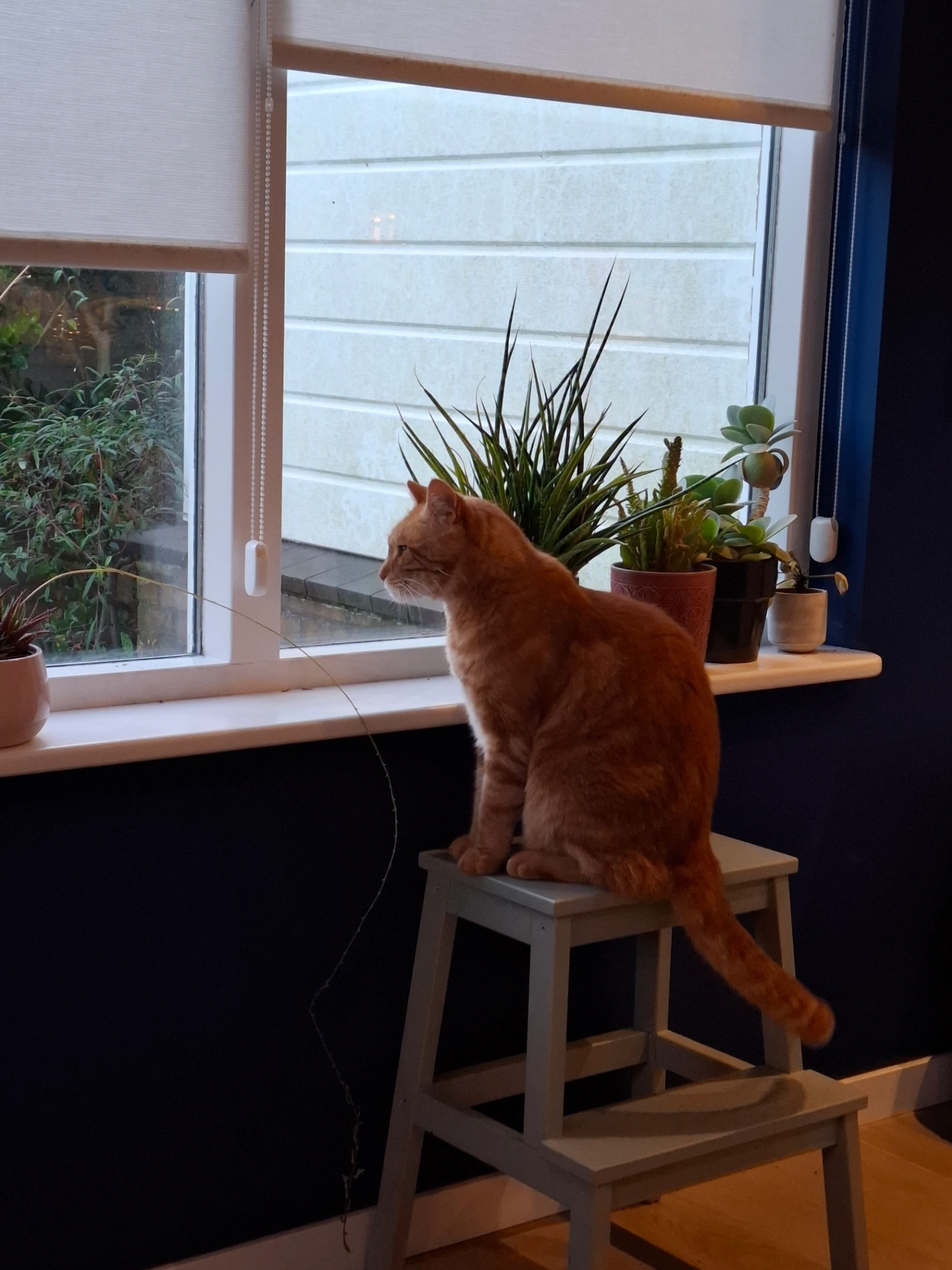 Zwelgje is een grote rode kater met een wit kinnetje en witte pootjes. Hij is nieuwsgierig, maar vindt t spannend als hij alleen is of vuurwerk hoort. Hij kan dan uithalen.