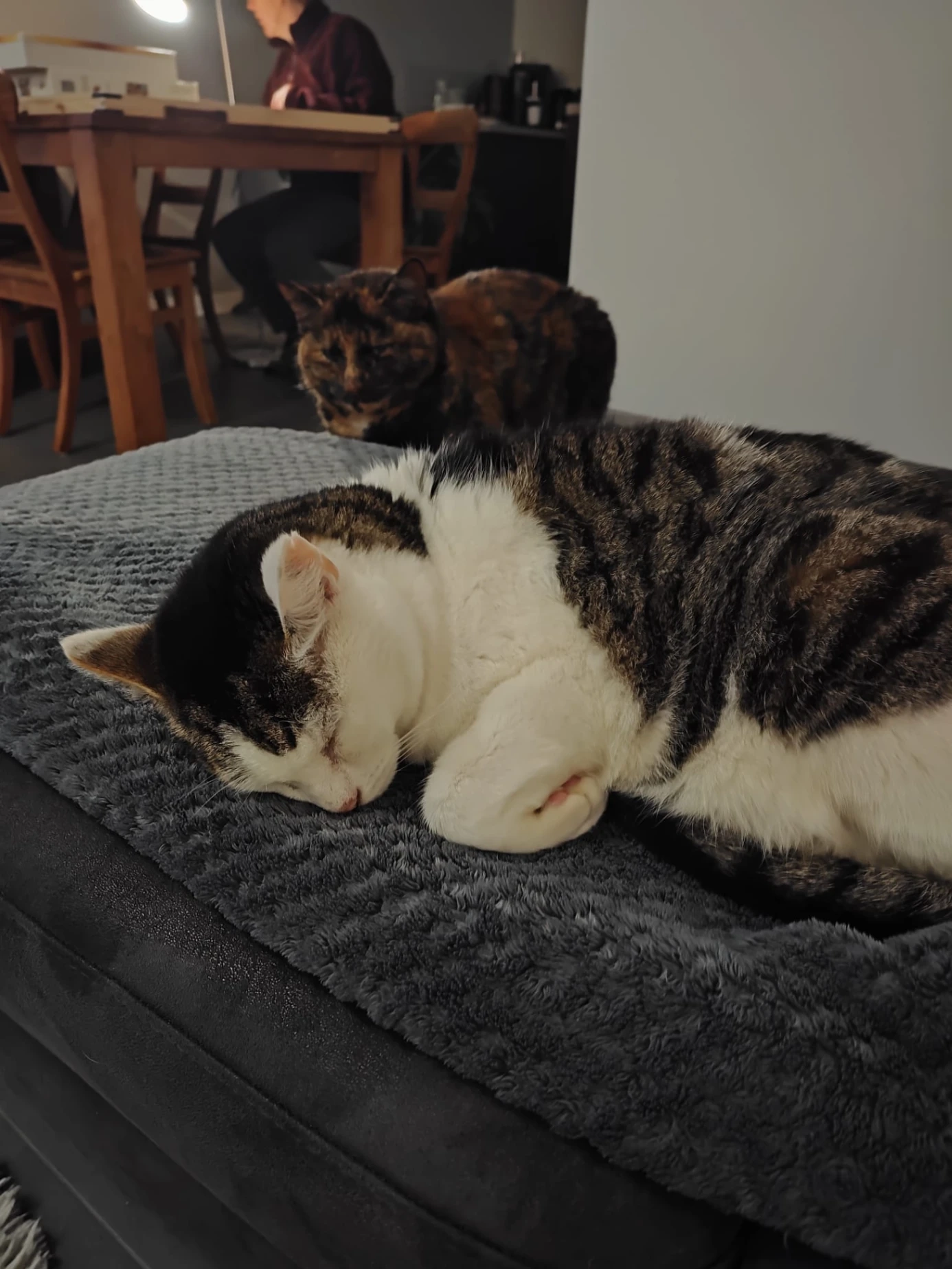 Sammy is een kater van 11 jaar. Hij heeft een scheurtje in zijn oor. Hij is half wit half donker met strepen. Witte oren. Donker bovenop zijn kop en rug.