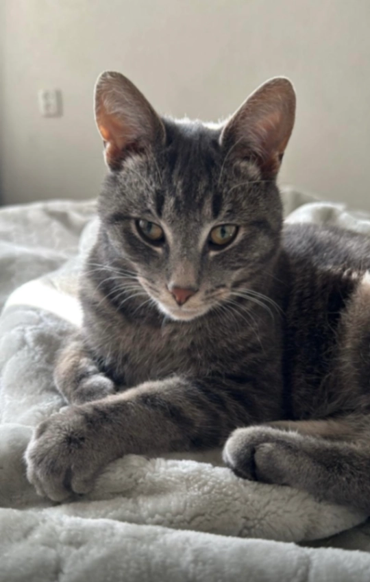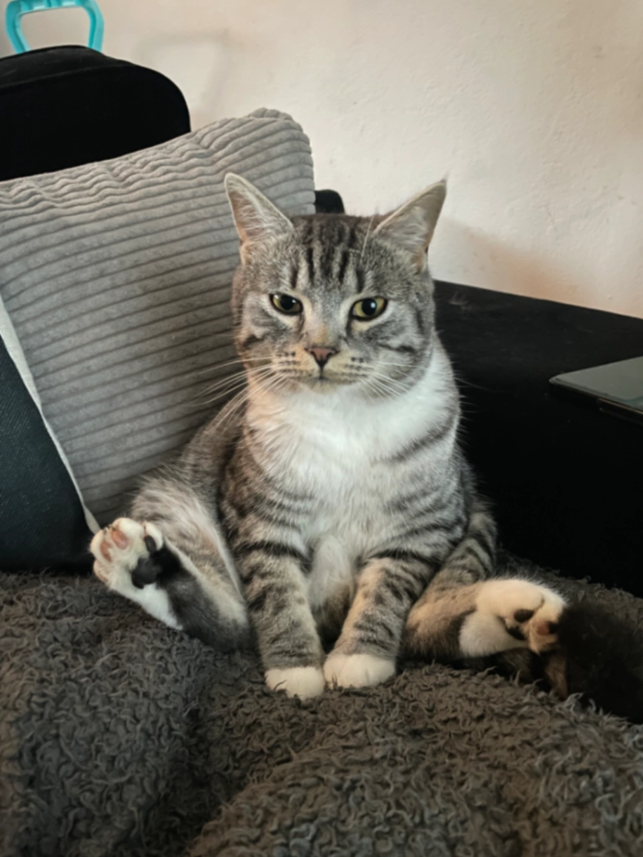 Een bolle grijze kat met zwarte strepen.