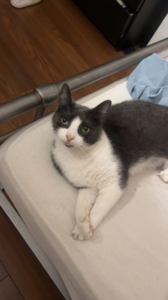 He is a cat with 4kg , grey and whitte , with a grey spot on his shin , and he is not very social with stangers