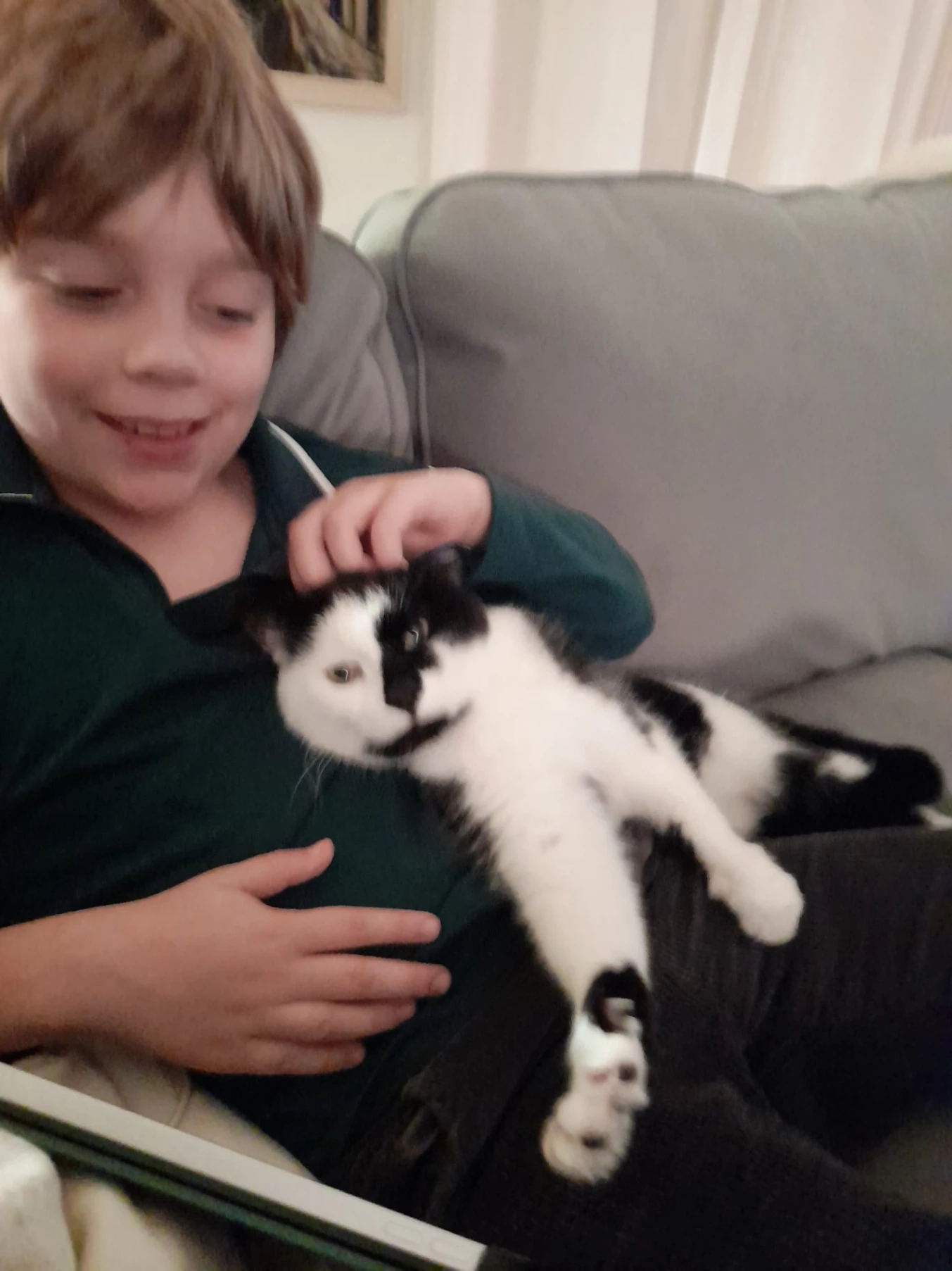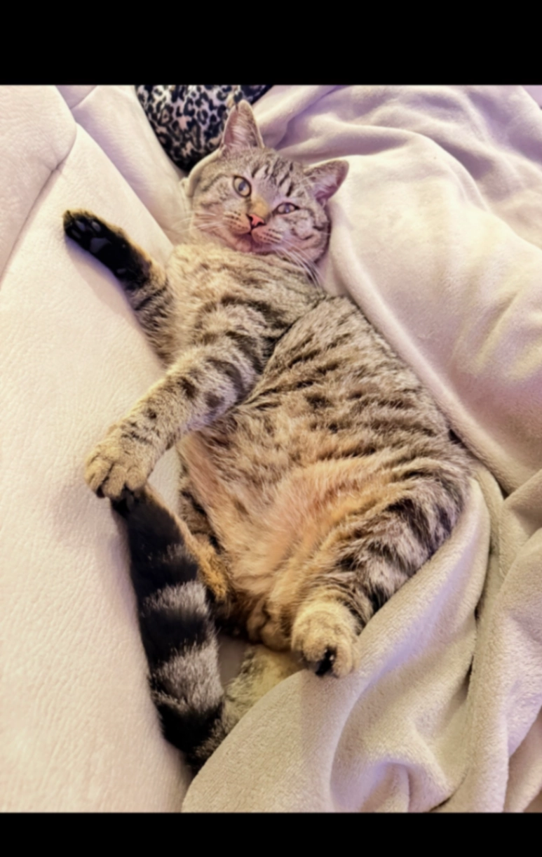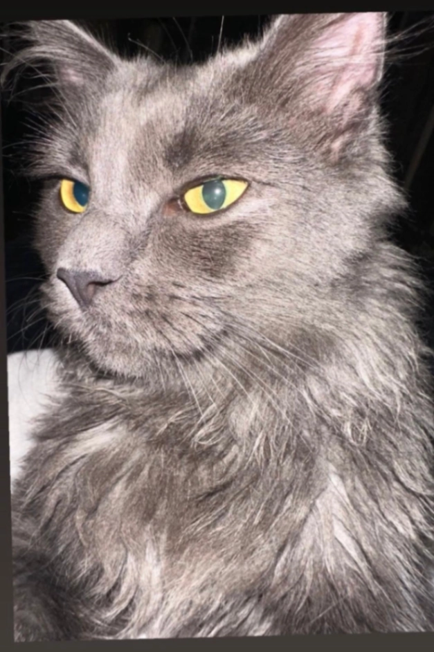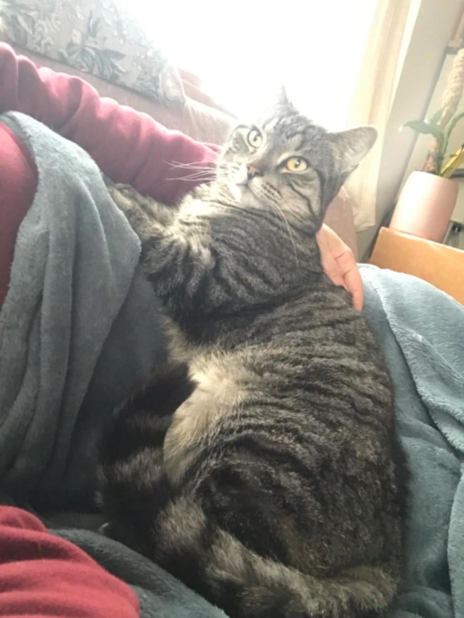 Pluizenbols is grijs met zwarte tijgerstreepjes en heeft een heel zacht vachtje. Het is een flinke kater (gecastreerd). Hij is wat schuw bij nieuwe mensen.