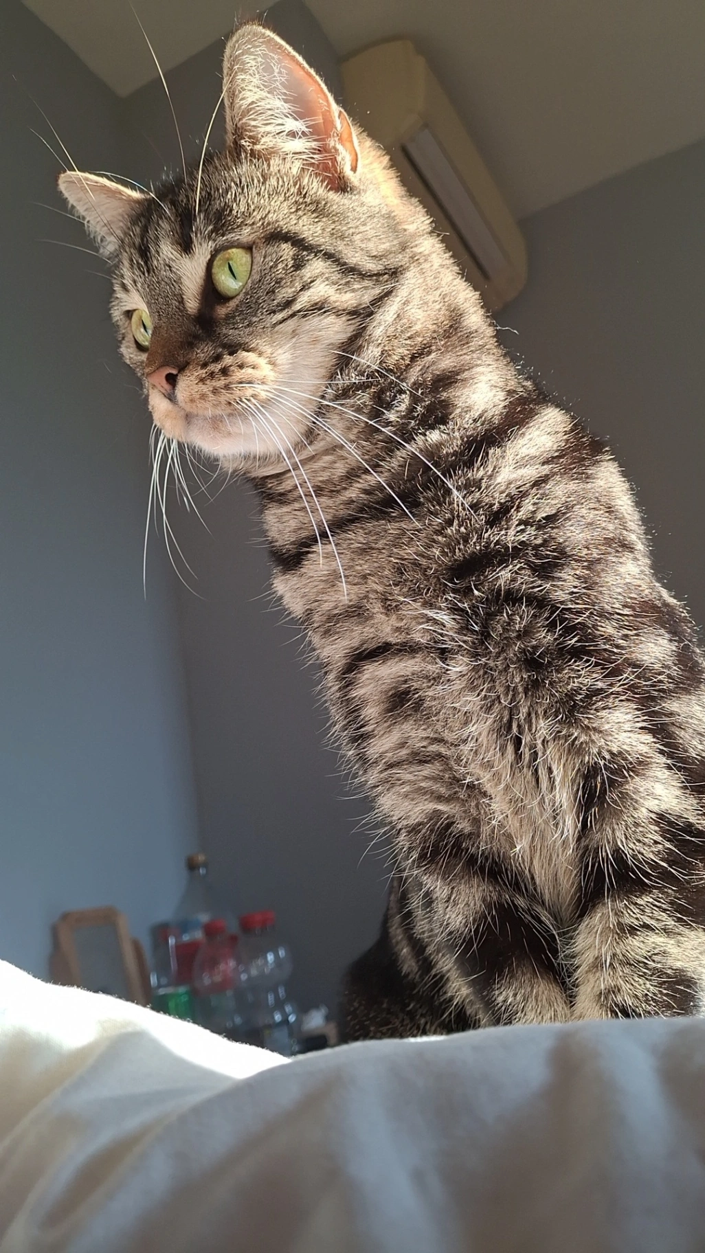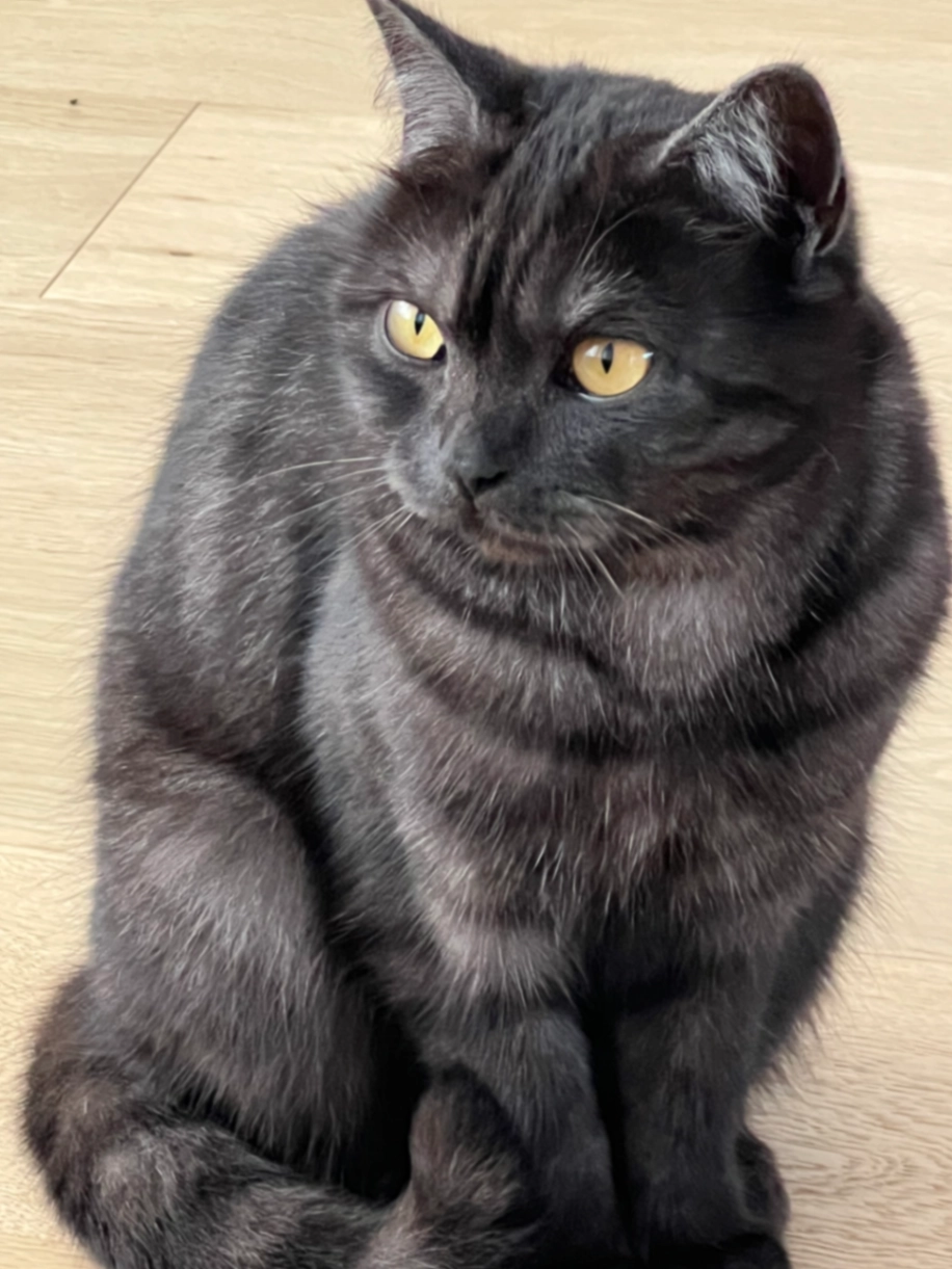Het is een kater zwart met grijs gestreept, gele ogen.