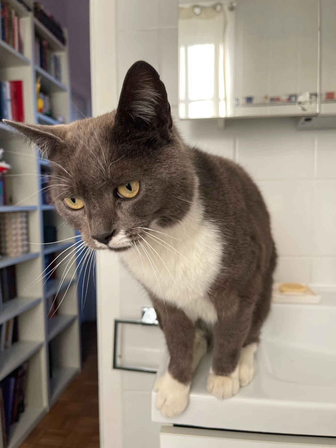 Very friendly grey and white male cat, castrated and microchipped. Loves people, other cats and even dogs. May be feeding outside the house and have taken shelter there..