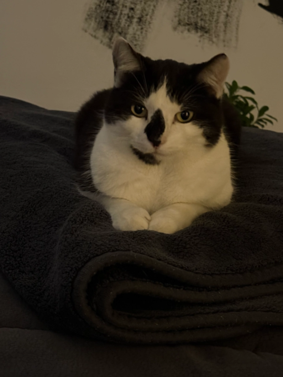 Schwarz-weiße Katze, sterilisiert, schlecht sichtbares Tattoo im Ohr. Fremden gegenüber wenig zutraulich, reagiert auf den Namen.