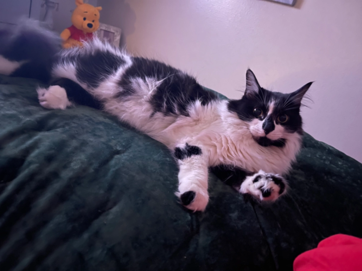All black with a little tiny white fur on the front of hos neck ,yellow eyes ,little head with pointy ears & NOT nuetured