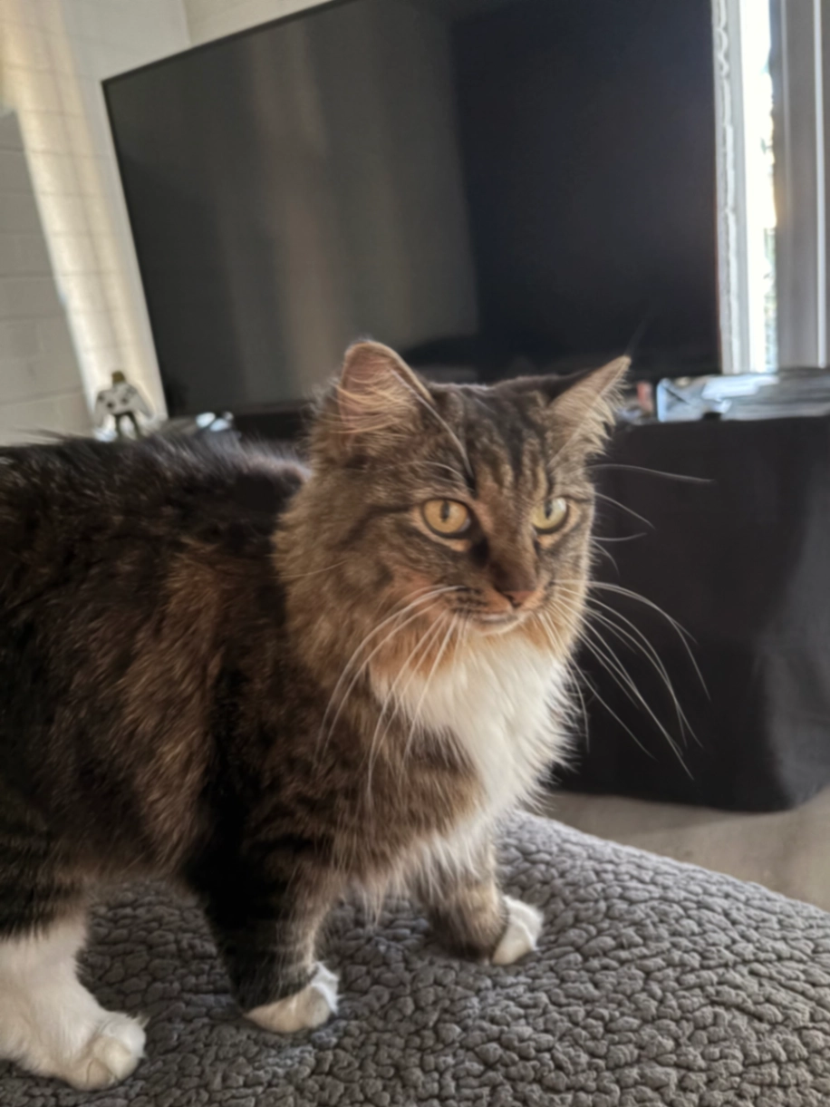 Vocal cat who loves treats and had white mittens and boots on