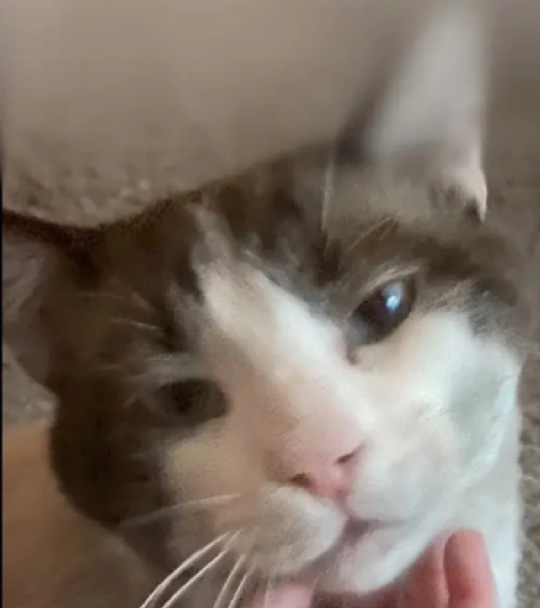 Small grey and white cat. She recently had surgery so she shojld be im bandages. If not her stomach is shaved. She has a black nose and black and pink paws with white whiskers