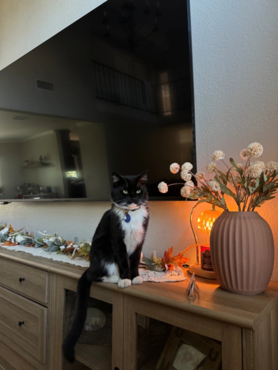 Wyatt is a tuxedo cat, he is chipped and has an apple AirTag on his blue collar. He is very friendly and his collar also says his name along with a phone number you can call if you find him.