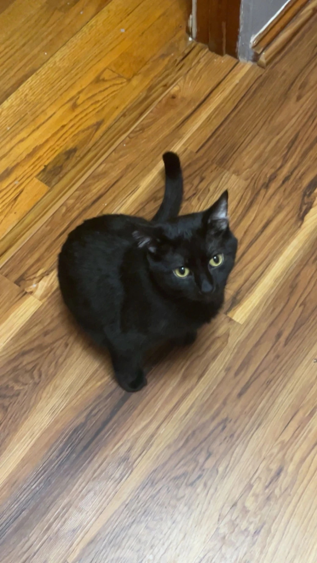 His name is Winston and he has a white flea collar on. His eyes are green ish and he is fully black. He doesn’t do treats, but he is food motivated.