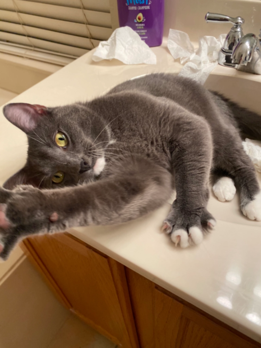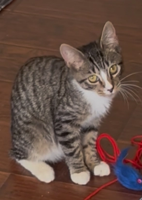 Tilted head, white paws belly and chest
