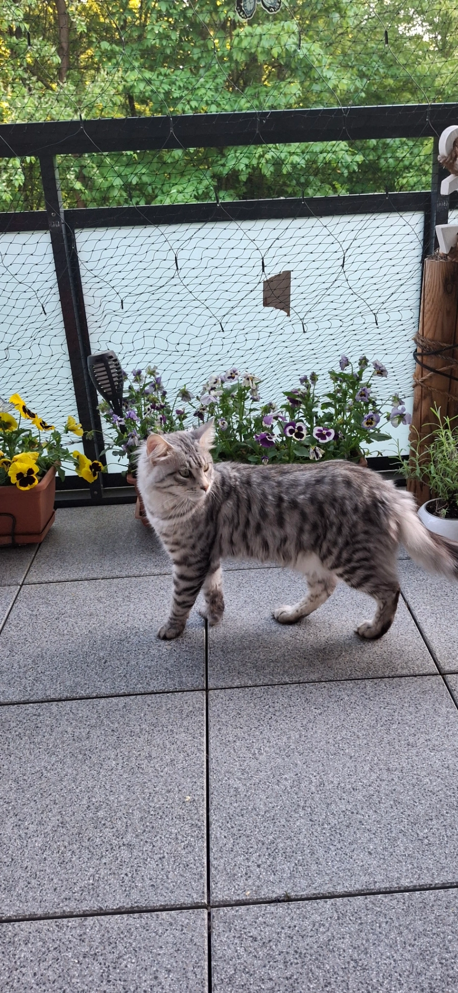 Sie ist oben schwarz-grau-rötlich getigert, mit weißem Bauch, Latz, Nase, Pfoten. Eher klein und sehr vorsichtig.