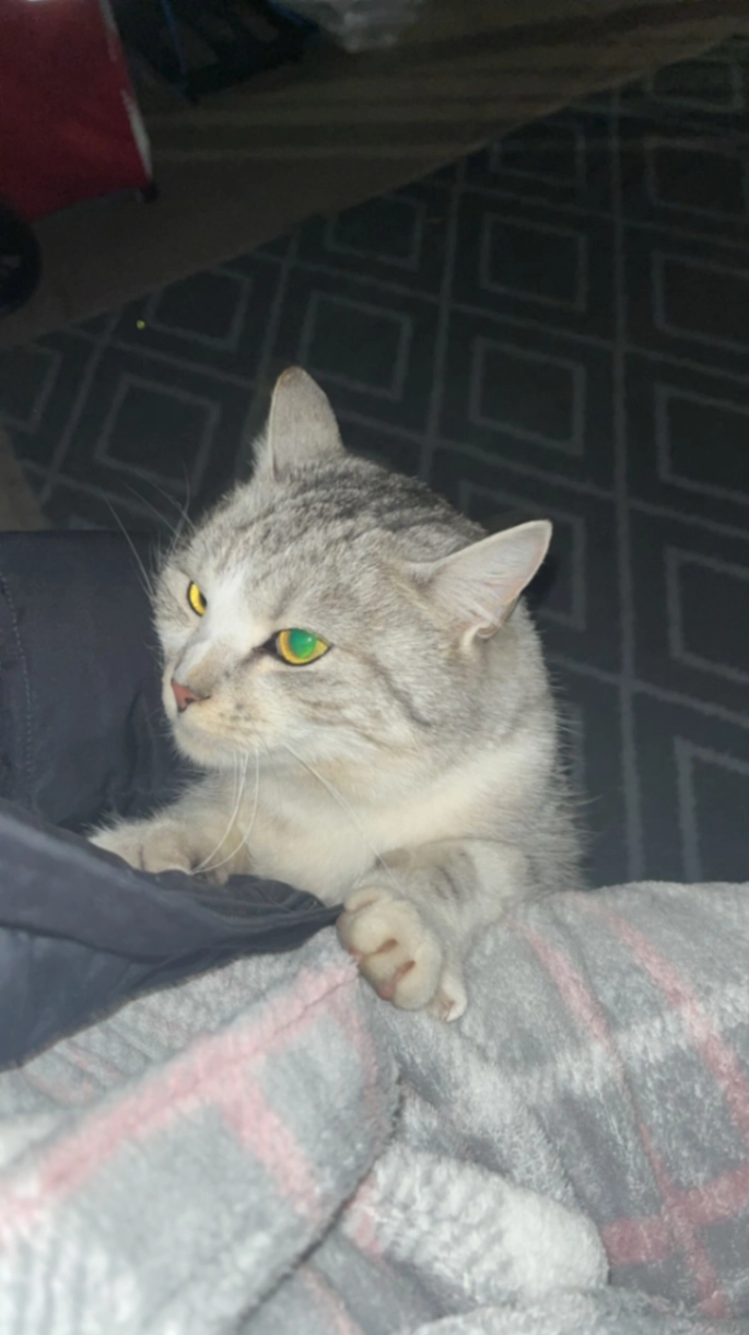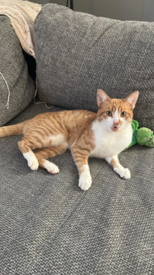 Er ist weiß rot getiegert und hat einen Fleck auf der Nase. Er hat auch eine Verletzung am linken hinter Bein, er ist uns aus der Transportbox vor dem Tierarzt entkommen