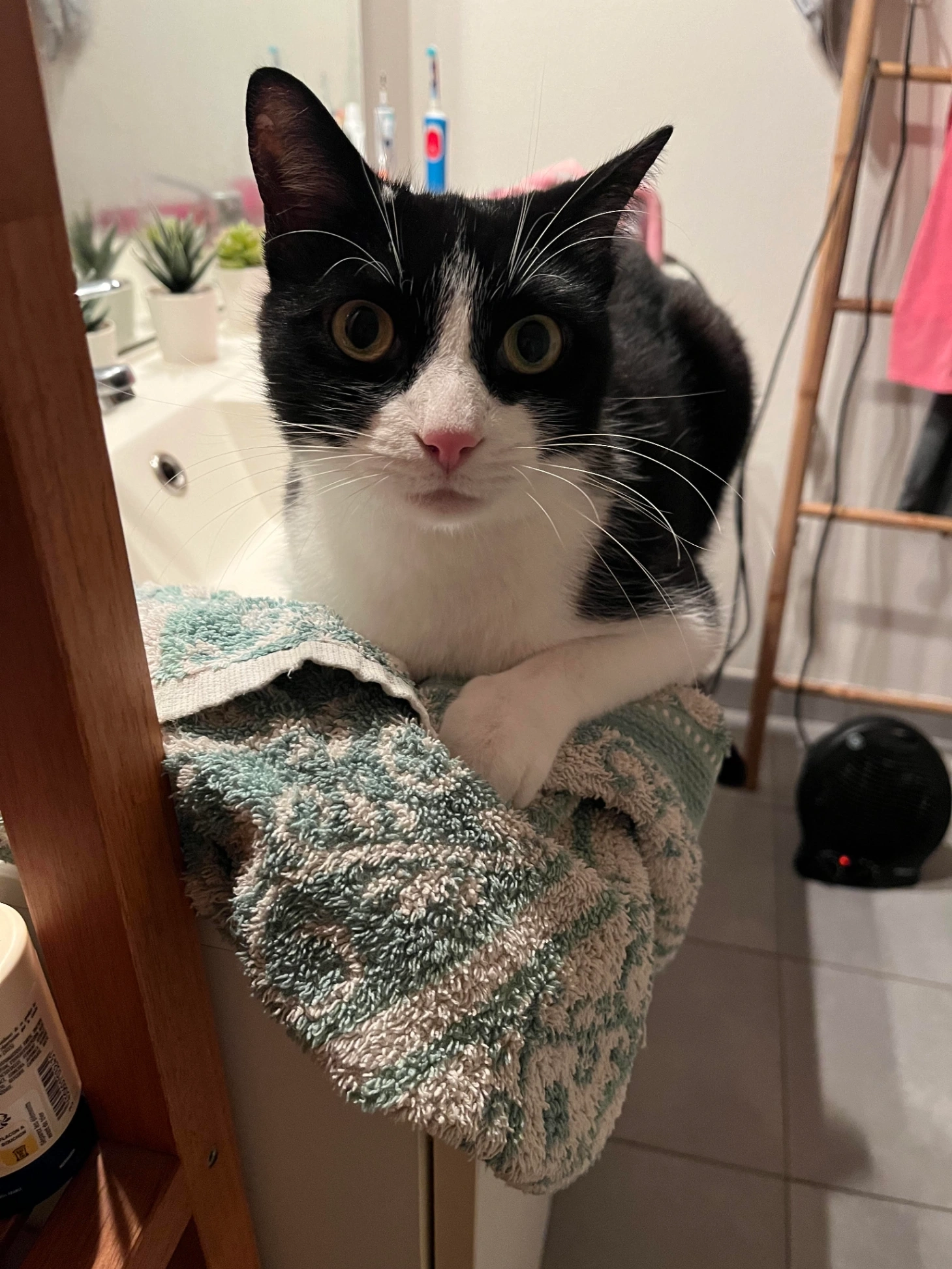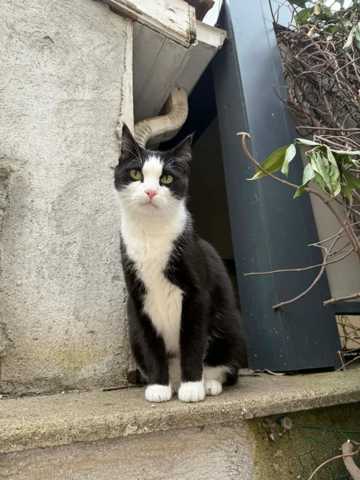 Chat noir et blanc relativement sociable se balade habituellement dans les jardins mais a tendance à venir dans les maisons si les fenêtres sont ouvertes