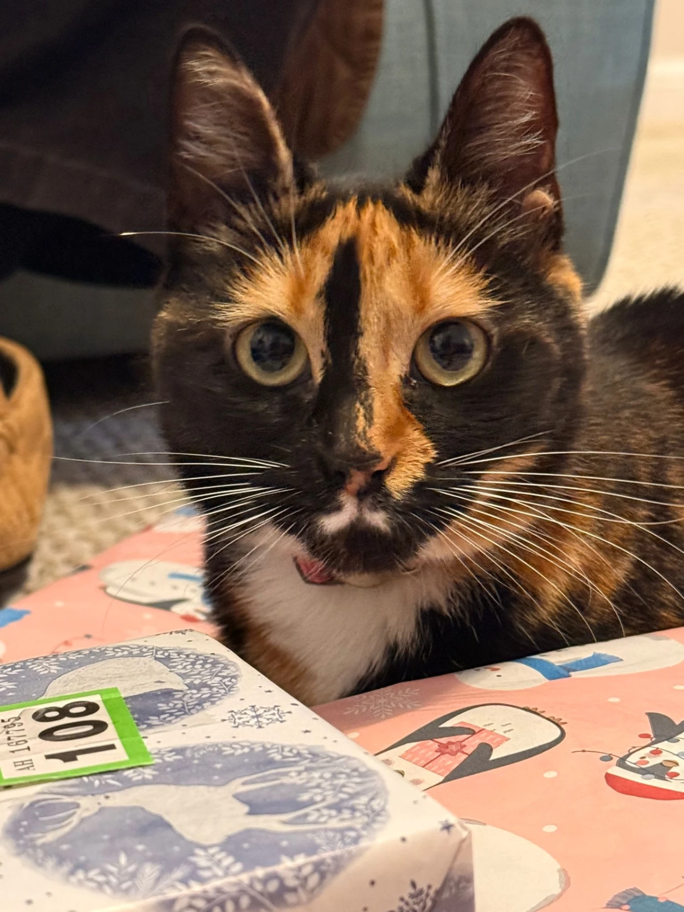 Pickles is a short-haired Tortoiseshell cat with four white paws and a white mark underneath her left eye. No collar but she is microchipped.