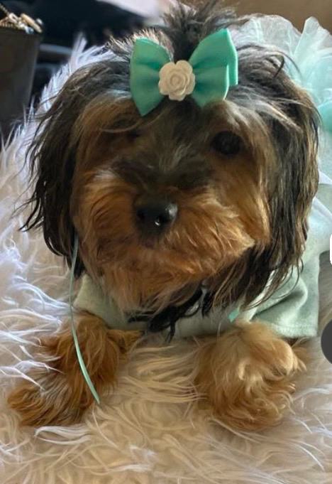 Yes Bella hasn’t been groomed so her hair is everywhere covering her eyes she small she’s brown grey & black the top of her hair is grey whoever has her will know she barks all day and cries if she misses me pls we want her back