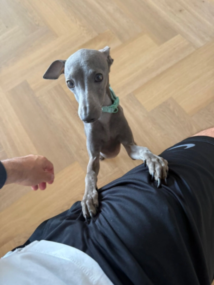 9 month old Italian greyhound wearing blue collar and beige harness. Very skittish so approach calmly and quietly