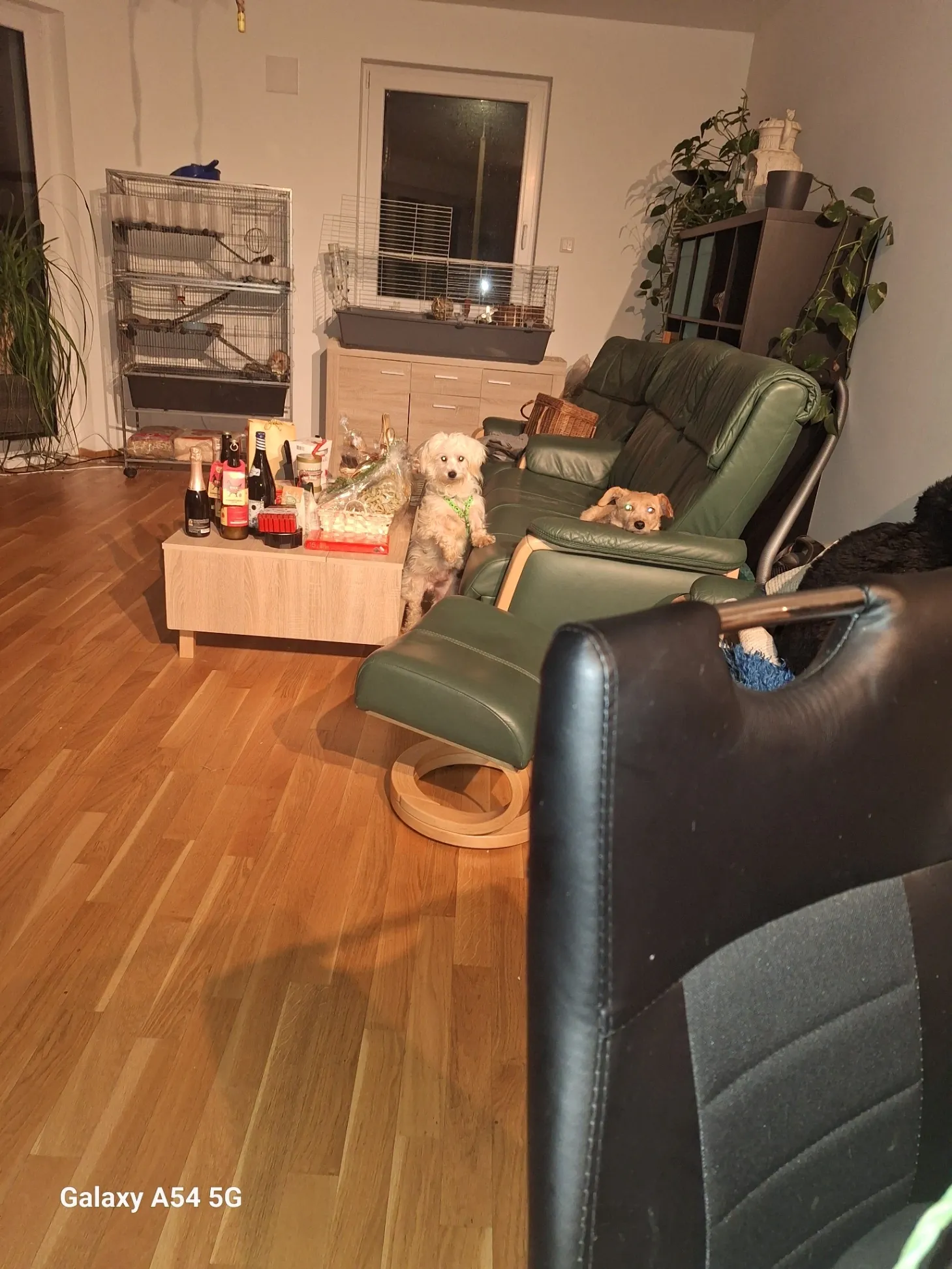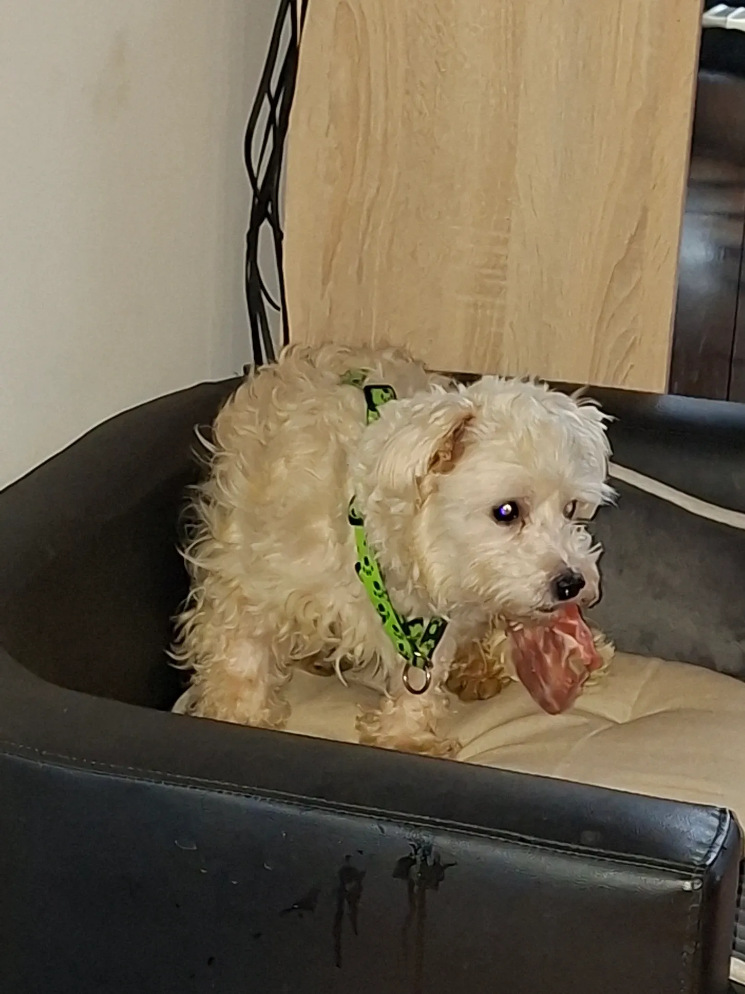 Weisser Maltesermix Rüde weiss mit einem roten Sicherheitsgeschirr sehr scheu