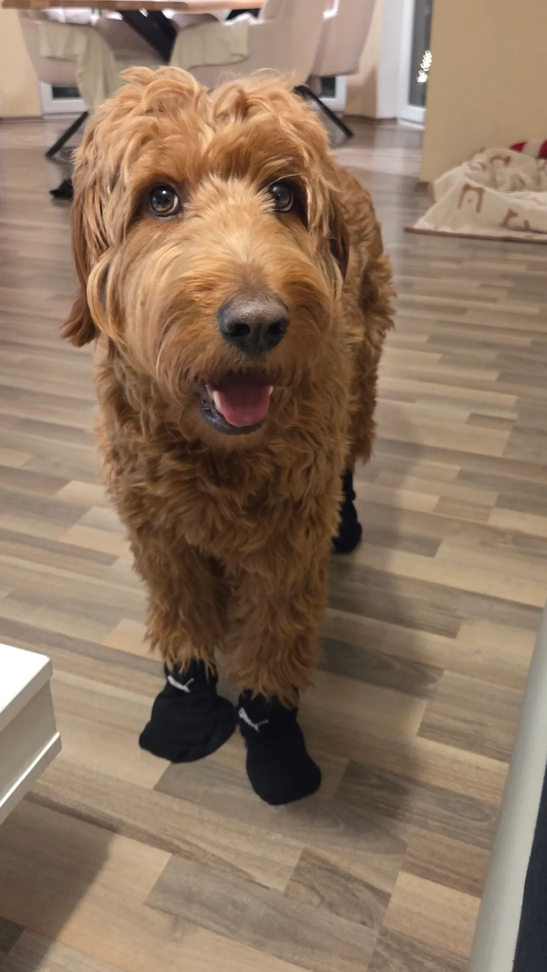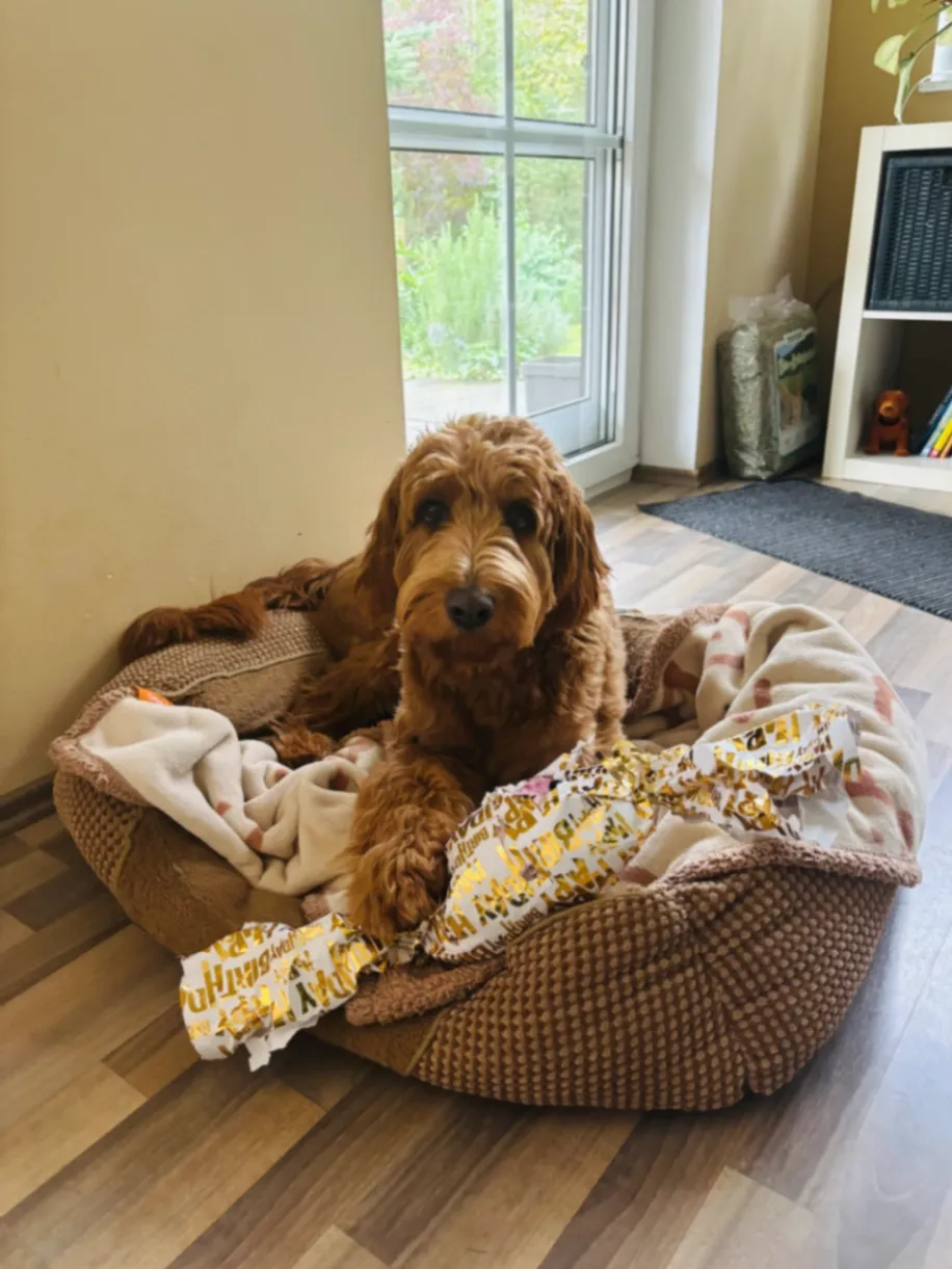 50cm hoch, rotbraun, sehr flauschig, wie ein lebendes Kuscheltier