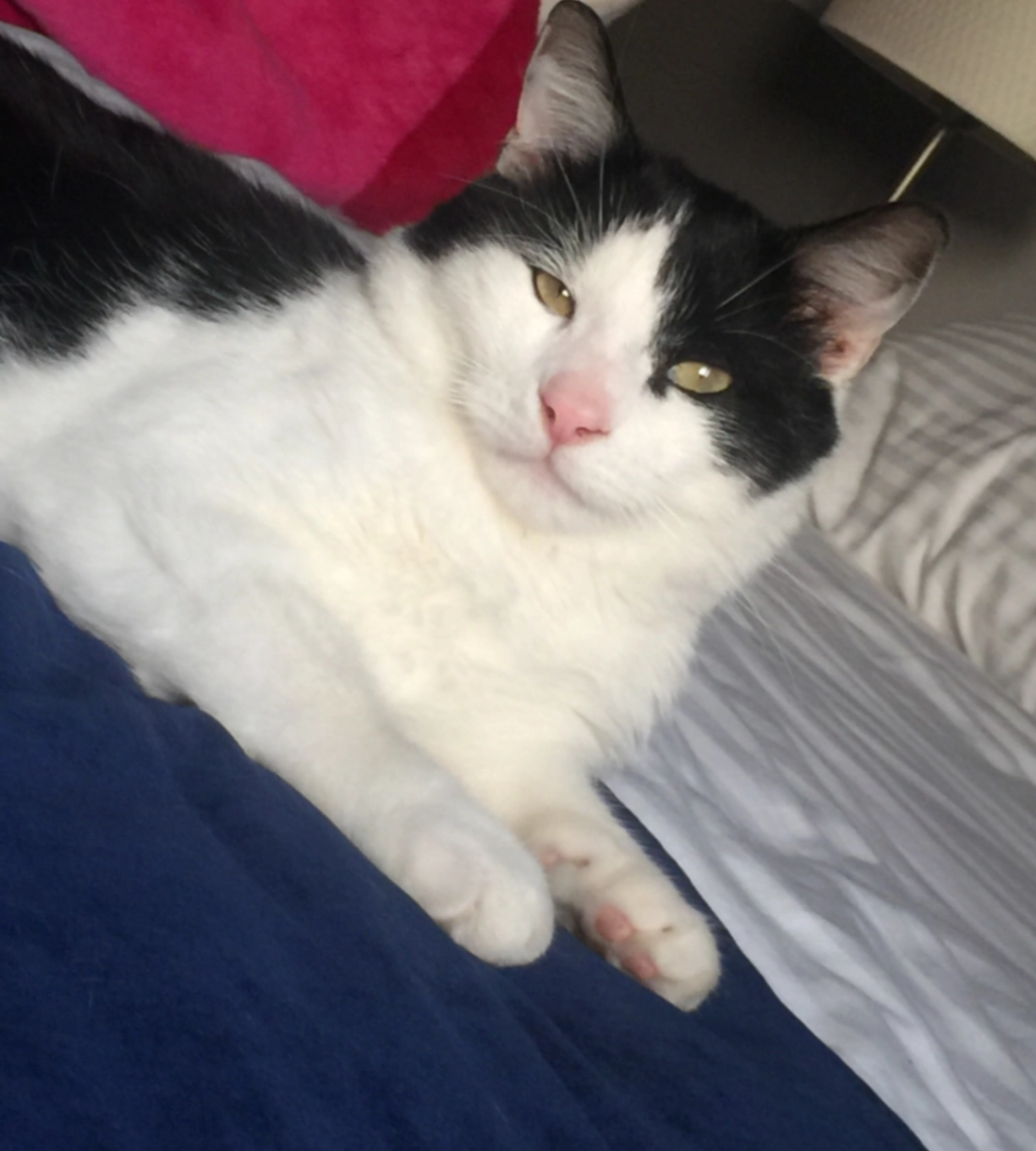 Sultan vit avec nous depuis 5 ans. Il s les pattes blanches. Il est très affectueux. S il veut rentrer a la maison il doit traverser l autoroute 13!!! On est TRÈS INQUIETS